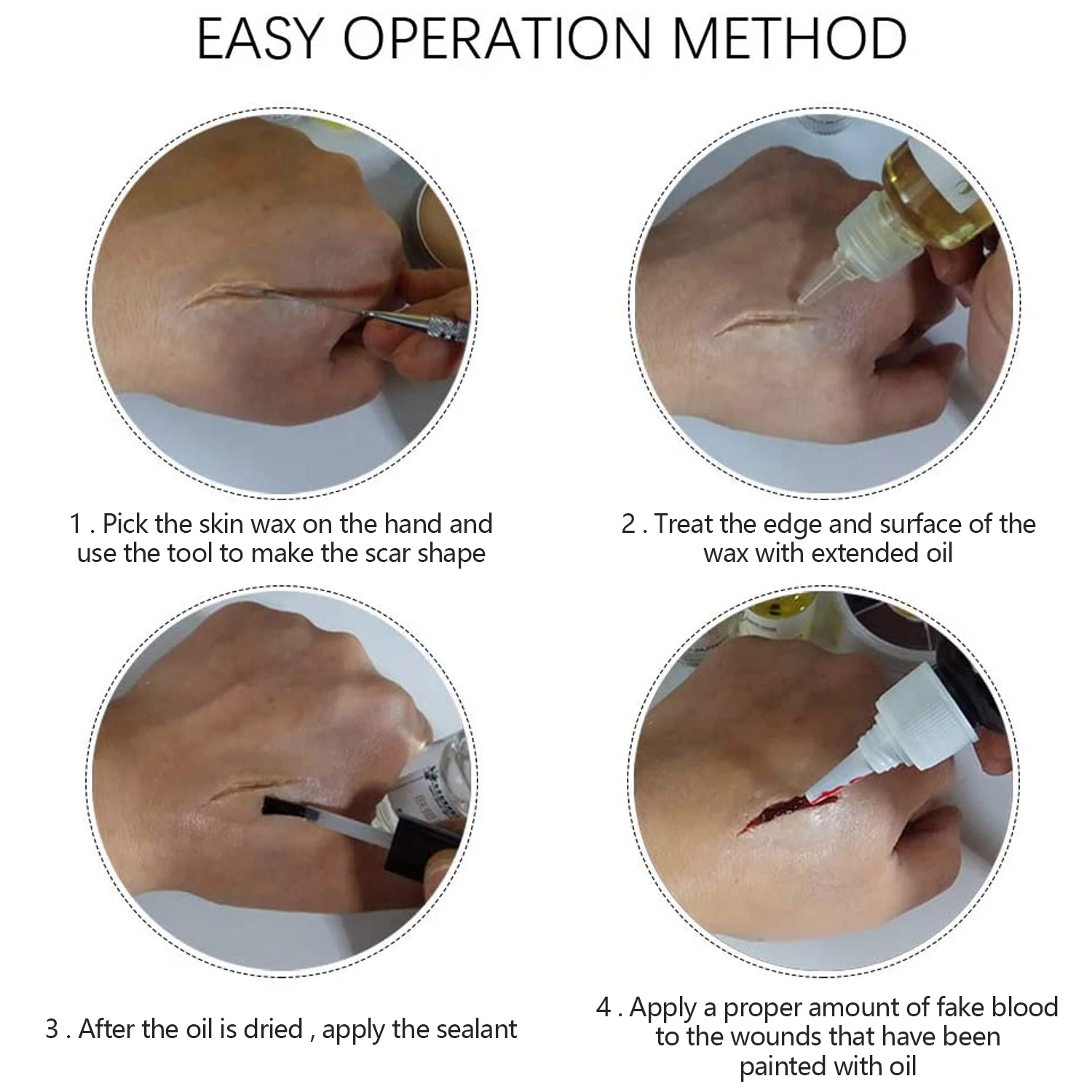 Создать реалистичные эффекты:Шрамовый воск может создать царапины, порезы или РАН, чтобы достичь, как настоящая поверхность, отличный трюк, чтобы удивить и пугать ваших друзей. Также можно использовать для блокирования бровей или создания травм на подвижных частях тела.