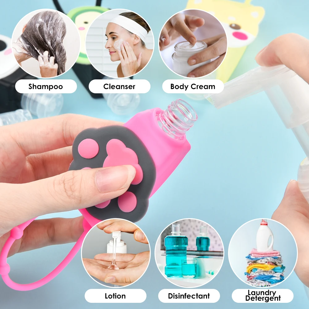 Specification:Condition: 100% Brand NewMaterial:Silicone+PlasticShape:CartoonSize:As the picture shownFeature:1. Tightness, three leak-proof design , has a unique valve leak2. Extremely lightweight, compression impact, especially the choice of food-grade silicone material+PP material, there is not an ordinary silicone material , super resilience and wear lightweight, waterproof , travel more easily3. The wide mouth design, more convenient irrigation4. The daily large bottle supplies dispensed into vials , which saves space, but also to ensure that the security guards of products, more convenient to carry5. Outdoor travel companion, liquid packaging, lanyard design, convenient and practicalPacking Included:12PCS* Cartoon Bottles(with two bags)/ 12PCS* Cartoon Bottles(no bags)