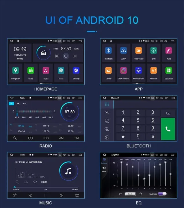 1.Android 10,0 RAM: 2 ГБ DDR3 ROM: 16 Гб 2.Android 10,0 RAM: 4 Гб DDR3 ROM: 32 ГБ 3.Android 10,0 RAM: 4 Гб DDR3 ROM: 64 ГБ Разрешение экрана: 1024*600 или выше, емкостный 5 точек мульти-касания, с функцией двойной зоны Bluetooth 5,0 ручная синхронизация телефонных звонков список контактов Встроенная функция Wi-Fi (Используйте точку доступа со смартфона для подключения к Интернету) Встроенное приложение Google Play Store, загрузите приложение, которое вы хотите. Оперативная память: DDR3 4 Гб, поддержка внешней флэш-памяти 32 Гб Встроенная автономная карта GPS, поддержка онлайн-карты, поддержка Google Map. Аудиовыход 4*50 Вт, эквалайзер: 9 эквалайзеров для звука Радио чип NXP6686, AM / FM с RDS