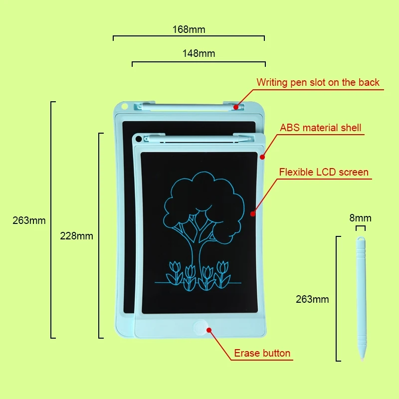 Многоцелевой и веселый: электронный планшет для письма, большой помощник для рисования, заметок, заметок, напоминаний, массажа, черновика, каракули и т. д. Идеальный инструмент для детей, дизайнеров, деловых мужчин, офисных семейных заметок и общения с глухими людьми. В отношении к окружающей среде и удобный для глаз: окружающую среду электронный блокнот, письма, Более 100000 раз. Больше не беспокойтесь о потере бумаги и уничтожении деревьев; ЖК-экран, отсутствие излучения, отсутствие бликов, защита глаз и безопасность для использования в школе и по всему дому, в офисе. Чувствительный к давлению экран: планшет изготовлен из прочных пластиковых материалов и оснащен чувствительной к давлению жидкокристаллической поверхностью, вы можете создавать линии различной толщины на основе того, насколько сильно вы нажимаете, как с помощью ручки и бумаги. Более яркие линии: ЖК-экран нового поколения позволяет ЖК-дисплею Cimetech быть ярче, чем другие, вам больше не нужно беспокоиться о яркости. Примечание: подходит для детей старше 6-9 лет! Подробнее: 8,5 "уникальный дизайн, использование высокого качества прочных и долговечных материалов, экономии заряда батареи по нажатию одной кнопки блокировки и один год гарантии.