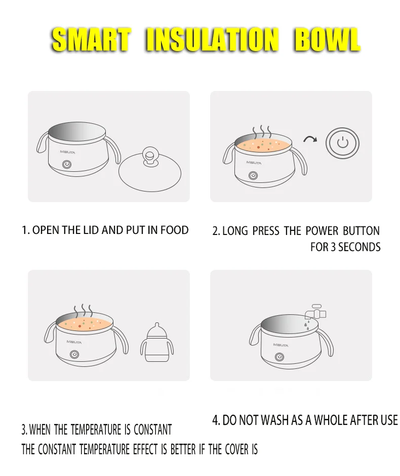 1. Откройте крышку и положите в еду 2. Нажмите кнопку питания в течение 3 секунд 3. Когда температура постоянная, эффект постоянной температуры лучше, если крышка 4. Не стирать в целом после использования