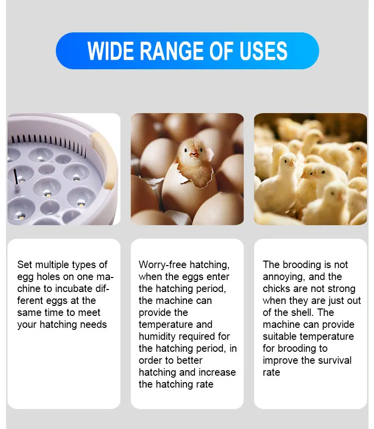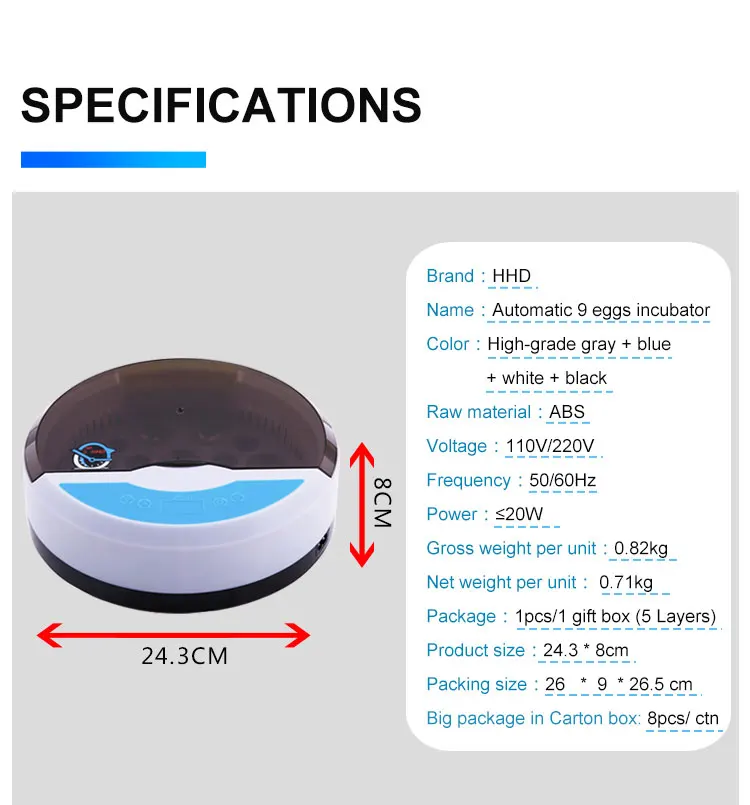 Особенности: 1. Полномашинное Производство АБС-сырья, Защита окружающей среды и долговечность. 2. Светодиодный высокоэффективный яичный аппарат. 3. Вентилятор с низким уровнем шума, более разумный циркуляционный воздуховод. 4. Керамический нагреватель (температура обмотки кольцевой машины более стабильная, точная и без мертвого угла) 5. Грязь может быть вывезена блистерным лотком для более легкой очистки. 6. Конструкция влажной губки для предотвращения чрезмерного добавления воды от воздействия на вылупление машины 7. Скрытая розетка питания, безопаснее и красивее. 8. Часть дисплея температуры более красивая с прозрачным материалом ABS. 9. Круглый дизайн канал подачи горячего воздуха проходит через переднюю и заднюю части и имеет постоянную температуру. 10. Автоматический контроль температуры, автоматическое отображение текущей температуры. 11. Обтекаемая сенсорная работа с высококачественной атмосферой. 12. Интегрированный Ультратонкий корпус не занимает места, что облегчает транспортировку и экономит лишние затраты. Параметры: Наименование: 9 автоматических инкубаторов Цвет: серый + синий + белый + черный Материал: АБС-пластик Напряжение: 110/220V Мощность: ≤ 20 Вт Размер изделия: 26*9*26,5 см Упаковка включает в себя: 1 x инкубатор 1 x Мощность кабель Руководство пользователя-1 шт.; Примечание: 1. Возможны незначительные отклонения в размере на 1-3 см (0,4-1,18 ") измерения выполнены вручную, допускаются отклонения в размере в пределах и небольшое отличие в цвете может незначительно отличаться из-за разных настроек экрана. 2. В связи с использованием разных по светильник экране монитора фактический цвет товар точно такой же, как и цвет изделия на фото может быть s светильник ly отличается из-за характеристик монитора компьютера. Пожалуйста, отнеситесь к этому с пониманием.