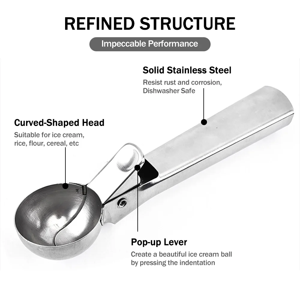 • Всплывающий рычаг-нажмите всплывающий рычаг дизайн и антипригарная матовая поверхность помощь для создания вокруг красивых мячей мороженого. Это более удобно и экономично для защиты слабых запястья.