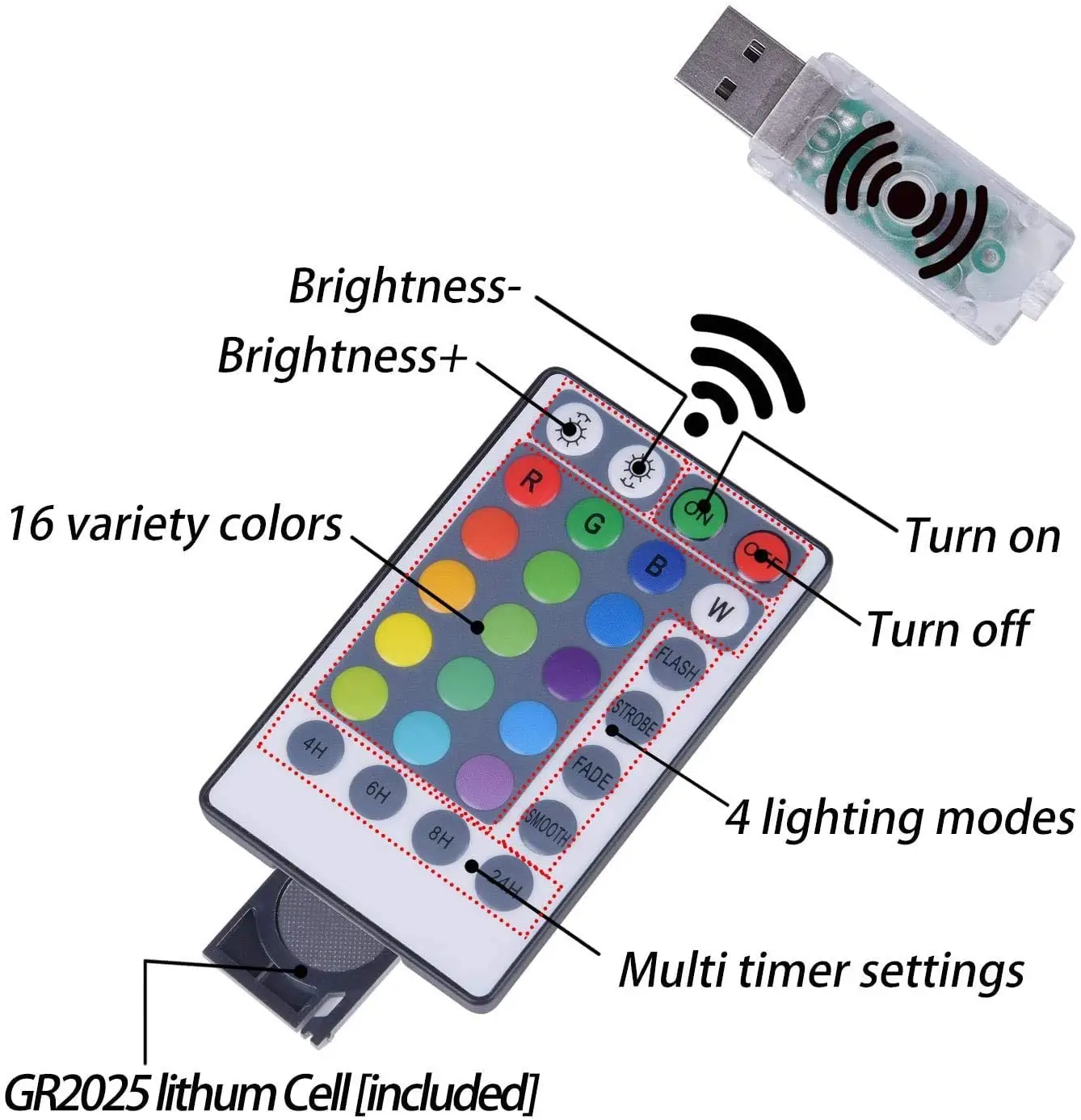 Регулируемый: 16 видов цветов, 4 режима таймера, 4 уровня яркости, 4 вида режимов мигания подходят для различных сцен.