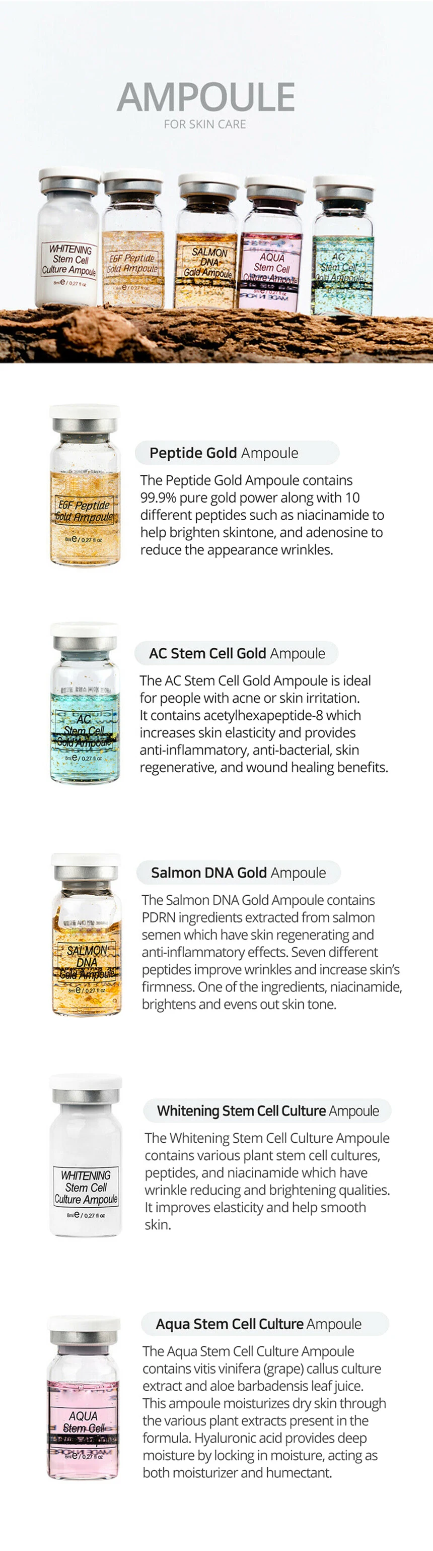 Золотая ампула для стволовых клеток переменного тока-идеальный продукт для людей, страдающих акне или раздражением кожи. Содержит RH oligopeptide-1 и ecetylhexapeptide-8, которые повышают эластичность кожи и обеспечивают противовоспалительное, антибактериальное, регенеративное и заживление ран. 99.9% золотой порошок помогает очистить и осветить кожу. Как использовать Поместите небольшое количество на всю очищенную кожу лица и шеи и гладьте ее до полного впитывания. Используйте утром. Избегайте прямого контакта с глазами. При возникновении контакта краску с водой и обратитесь к врачу. Может использоваться в комбинации с машиной МТС. Ингредиенты Вода, глицерин, масло семян, полиглутаминовая кислота Титан диоксид, Алюминий гидроксид, триэтоксикаприлилсилан, пропиленгликоль, циклопентасилоксан, циклогексасилоксан, цетиловый этилгексаноат, минеральное масло, полисорбат 80, стеариновая кислота, цетеариловый спирт, хлорфенезин, глицерил стеарат, Сорбитан стеарат, гидрокситилцеллюлоза, аллантоин, диметикон, Сорбитан кункиолей, экстракт листьев камелии Синенсис, Bambusa экстракт вулгараса, экстракт Borago Officinalis, экстракт кожуры цитрусовых Unshiu, экстракт плодов лигустрим Japonicum, экстракт корня Cnidium Officinale, экстракт плодов риуса Semialata galata Galla, экстракт фрукта Opuntia coccinelliferellifera prunus Persica (персик) экстракт ядра, экстракт листьев Pinus Sylvestris, экстракт корня Lobata, Экстракт листьев гинкго билоба, экстракт корня трихосантоса кириловии, динатрия ЭДТА, феноксиэтанол, Токоферил ацетат, Rh-Oligopeptide-1, красный оксид железа, черный оксид железа, желтый оксид железа, аромат.