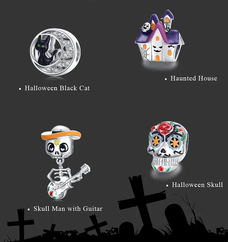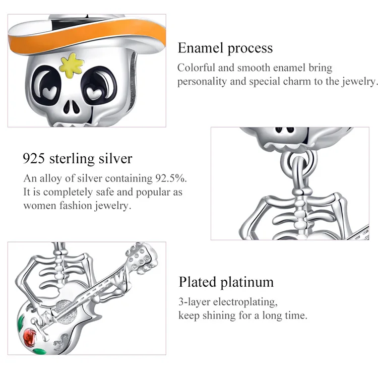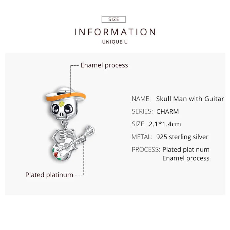 Материал: S925 + покрытая платина + эмаль Размер: 2,1*1,4 см Описание: Изображение человека-черепа, играющего на гитаре, используется в качестве вдохновляющего дизайна, и мастерство создает счастливую атмосферу Хэллоуина.