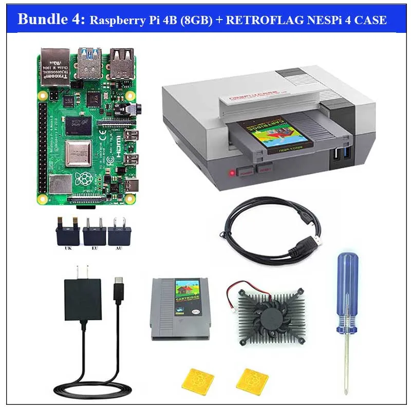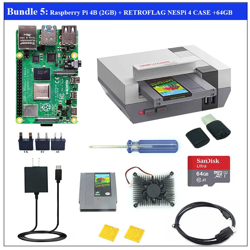 Комплект 5: 1 x Raspberry Pi 4B (2 ГБ оперативной памяти) 1 x чехол NESPi 4 1 x чехол NESPi 4 SSD (не включая SSD) 1 x USB-C источник питания (США) 1 х Вентилятор охлаждения 1 отвертка Руководство по эксплуатации-1 шт. 1 x адаптер UK/EU/AU (Выберите один адаптер. Примечание: Соединенные Штаты не имеют этого адаптера) 12 винтов 1 кабель Micro HDMI 2 x радиатор 1 x sd-карта 64 ГБ Кард-ридер-1 шт.