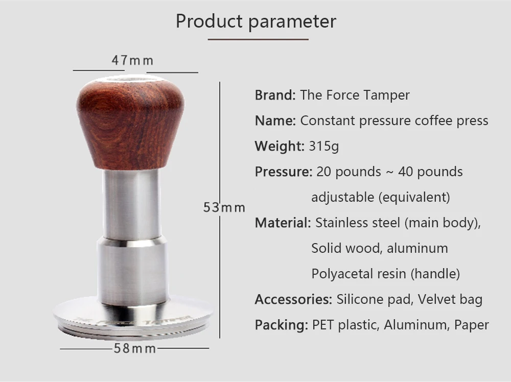 Материал: нержавеющая сталь, дерево, алюминий Размер: 58 мм Вес: 315 г Давление: 20-40 фунтов