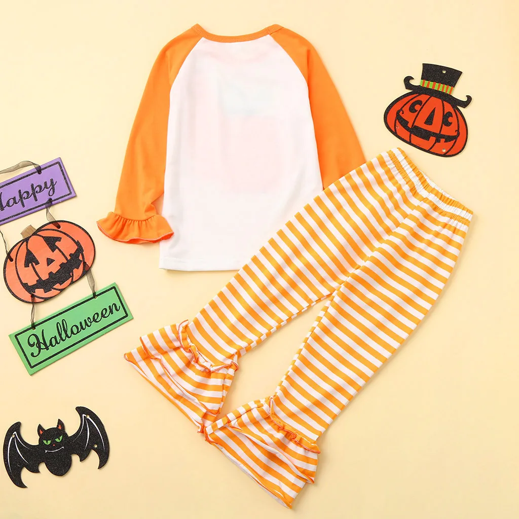 Топы с длинными рукавами и рисунком тыквы для маленьких девочек на Хэллоуин + штаны в полоску