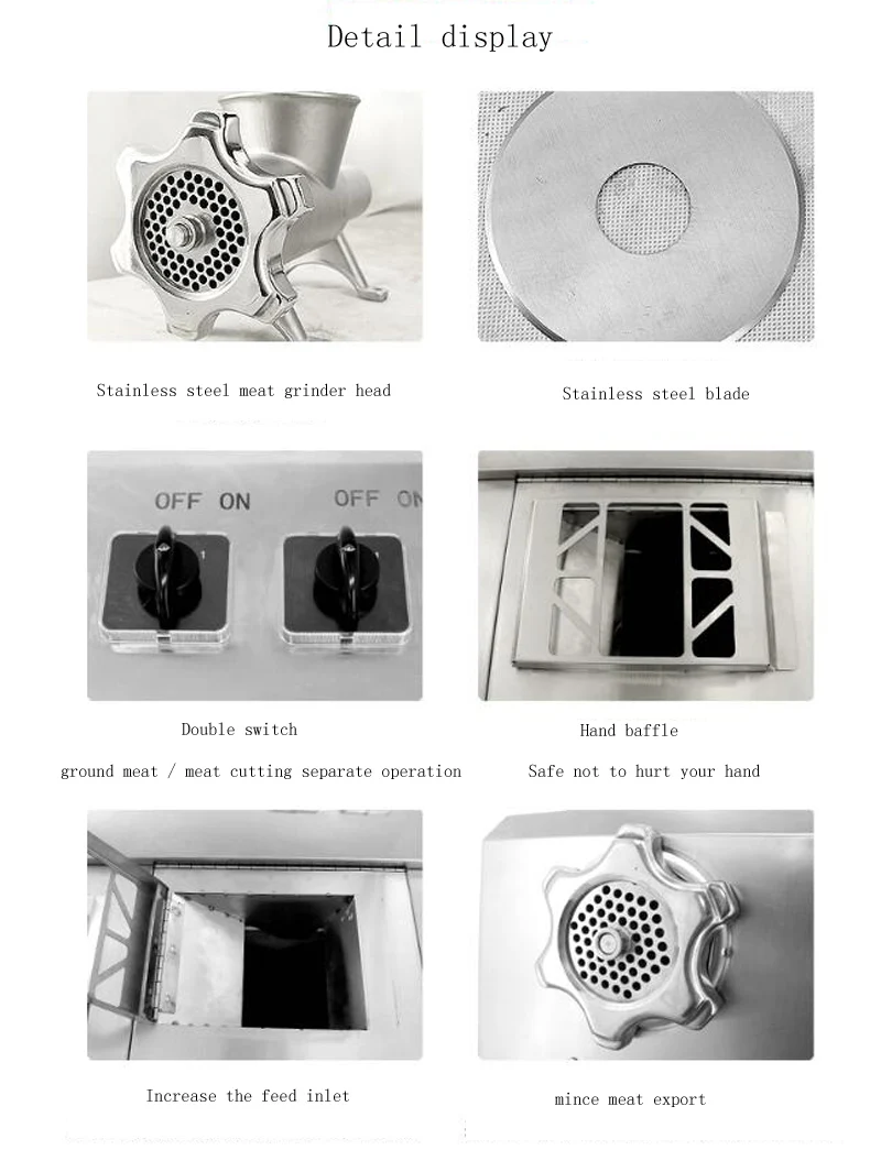 Напряжение: 220 В/50 Гц Мощность: 2200W Скорость вращения: 1400р/мин Функция продукта: нарезать мясо/фарш/клизму Вес: 90 кг Размер: 630*430*800 мм Ножи расстояние: 2,5 мм/3,5 мм/5 мм/7 мм/10 мм/15 мм/20 мм Диаметр лезвия: 104 мм