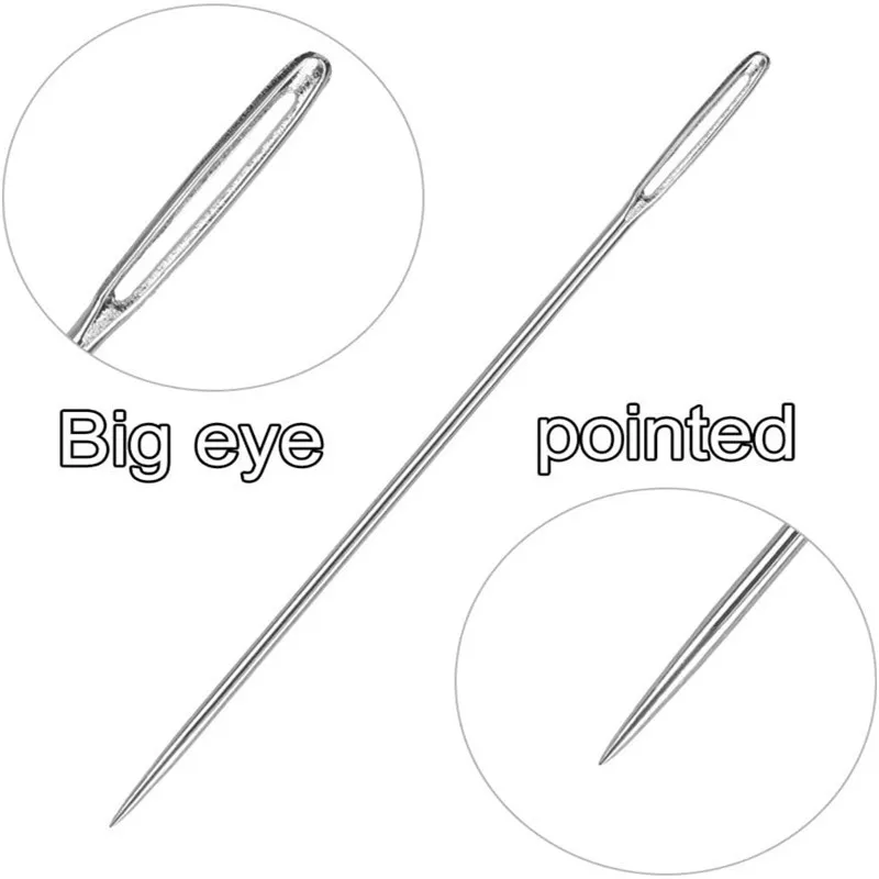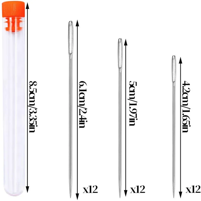 Тип: большие иглы для шитья глаз Использование: ручная работа DIY Материал: нержавеющая сталь Посылка включает в себя: Швейные иглы: 4,2 см/1.65in,5 см/1.97in и 6,1 см/2.4in Бутылка иглы: 8,5 см/3.3in