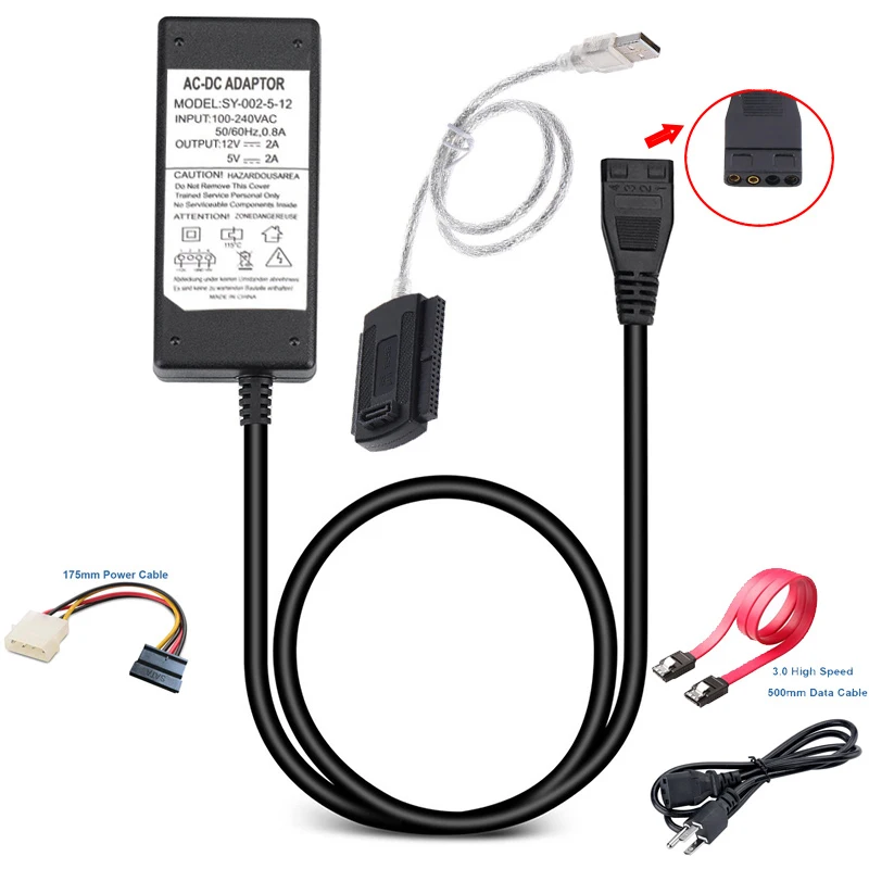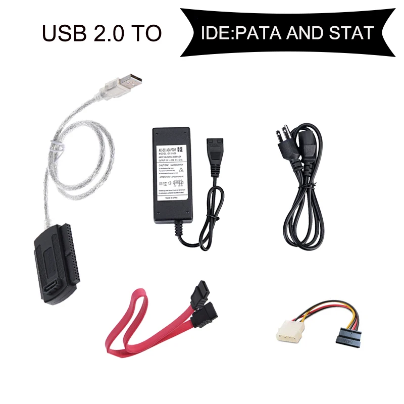 Посылка включает в себя USB в IDE / SATA Кабель-адаптер SATA Дата-кабель адаптер переменного тока в IDE конвертер питания IDE в SATA и кабель питания.