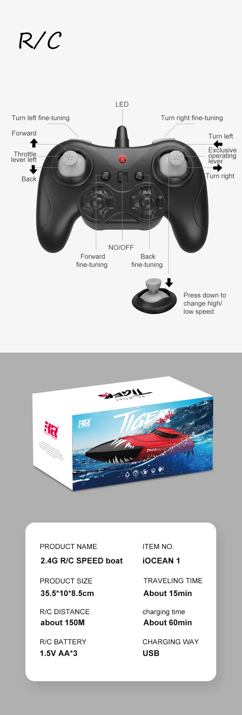 Цвет изделия фиолетовый/красный Одиночная лодка вес 360 г Форма упаковки: пена плюс цветная коробка, вес упаковки Частота передачи 2,4G батарея дистанционного управления 3 AA батареи Парусный спорт время ≈ 15 минут продукт батарея 7,4 V 600mAh аккумуляторная батарея Время зарядки ≈ 60 минут коробка цвета размер 38*18*15,5 см Дальность действия дистанционного управления ≈ 150 метра размер коробки 50,5*40,5*58 см Размер продукта 35,5*10*8,5 см количество упаковки 9 шт Характеристики двигателя 370 брутто вес нетто 8 кг/6,53 кг Скорость движения 25 км/ч объем FCL Функция: аксессуары Лодка с дистанционным управлением * 1 Пульт дистанционного управления * 1 Силиконовая Защитная головка * 4 Usb-кабель для зарядки * 1 Инструкции * Возможности обучения: Эмоция, зрение, интеллектуальное развитие, руки-на мозге, хватание, сенсорная, ручная координация, развитие других способностей, интерактивные игрушки, слуховой аппарат, родитель-ребенок, развитие интересов