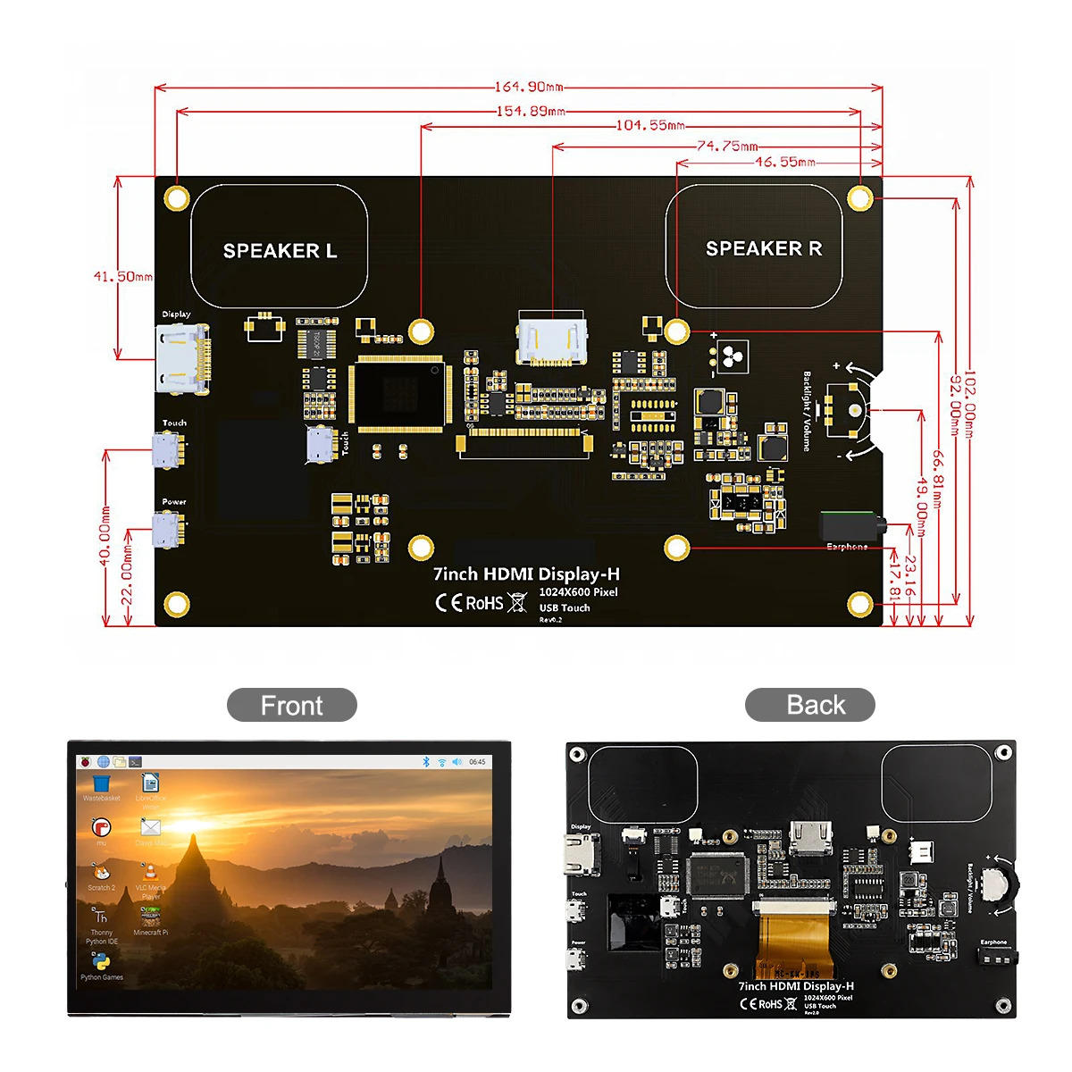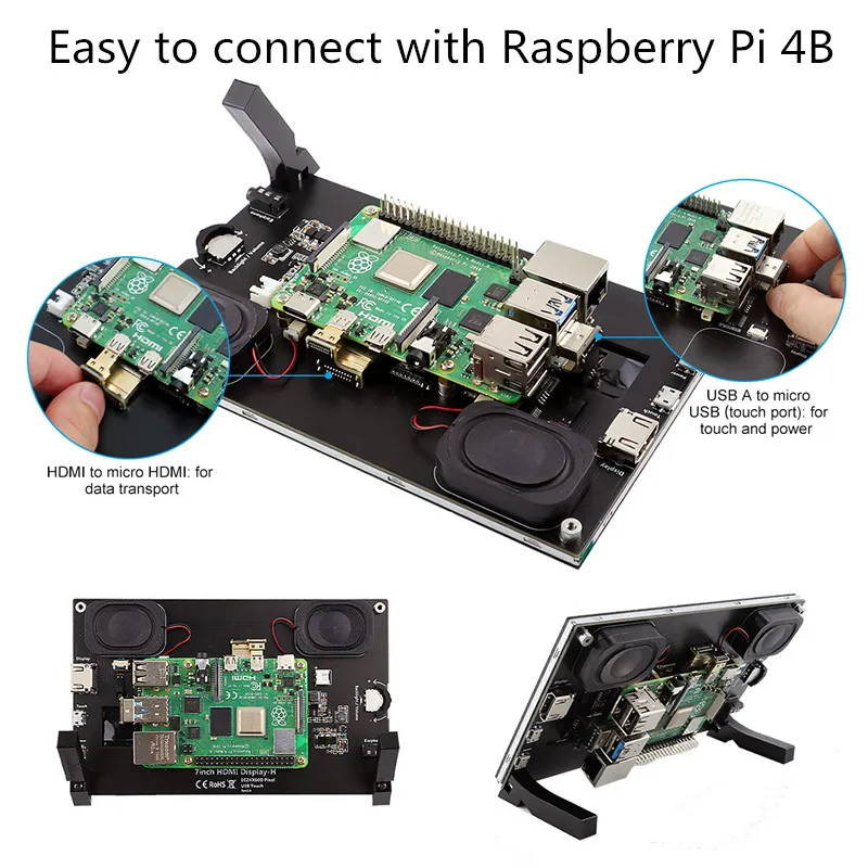 1x7 дюймовый монитор 1 usb-разъем Micro USB (для RPI 4B) 1 х HDMI к Micro HDMI разъем (для RPI 4B) 1 кабель USB-Micro USB (для подключения ПК) 1 кабель HDMI-HDMI (для подключения ПК) 4 винта M2.5 (для крепления RPI) 4 x маленькие медные столбы (для поддержки RPI) 2 x Профессиональная подставка 2 Винта M3 (для крепления подставки) 2 динамика 1 x Руководство пользователя