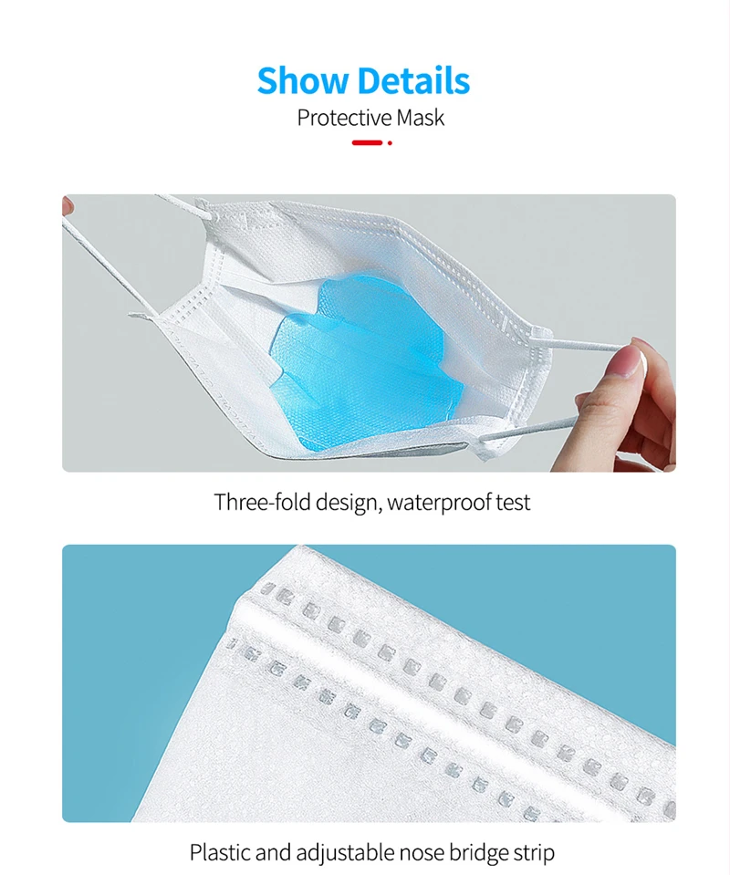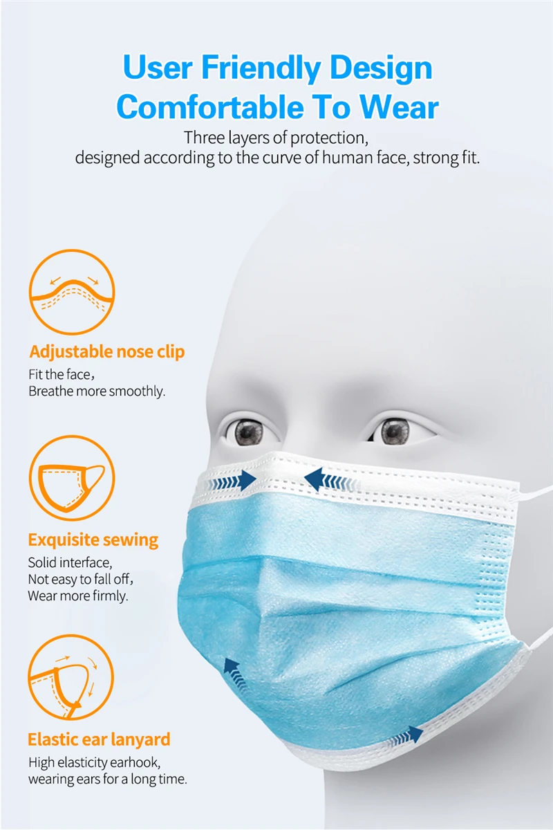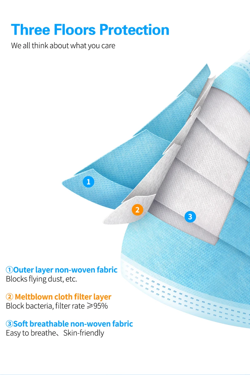 3 слоя Нетканая одноразовая маска изготовлена из 3 слоев нетканого материала, он безопасен для здоровья и безопасный для вас, чтобы использовать. Дышащий материал, который делает его полезным и модным. Специальный 3 слоя из нетканого материала, дизайн, обеспечивает некоторые меры защиты от пыли, автомобильный отходящий газ, пыльцу и т. Д. Эластичная петля уха позволяет легко снимать и надевать цепочку и не давит на уши. Маникюрный салон или любые другие области, где может потребоваться защита