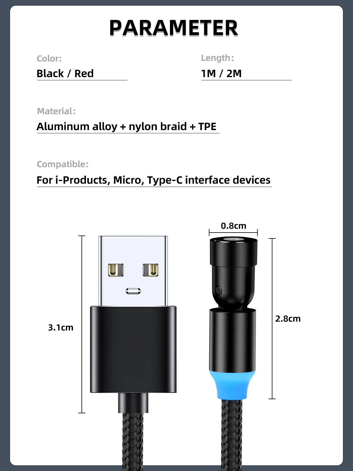 -Супер сильная Магнитная сила, вращение на 360 градусов. Не беспокойтесь о неправильном направлении. -Магнитный зарядный кабель, новый опыт зарядки, избавьтесь от оков подключения. Просто магнитный. -Разъем Micro usb,type c для устройств ios готов, удовлетворит ваши потребности практически в любом устройстве. Не стесняйтесь переключаться. -Нейлоновый плетеный провод 1 м/2 м более прочный, чем пластик. Мягкие и шелковистые. -Поддерживает ток до 2,4 А и больше не беспокоиться о скорости зарядки (в зависимости от зарядного устройства и вашего устройства). -Улыбка индикатором СИД светильник, немного светильник, приносит вам радость без бликов. -Конструкция кабеля только для зарядки