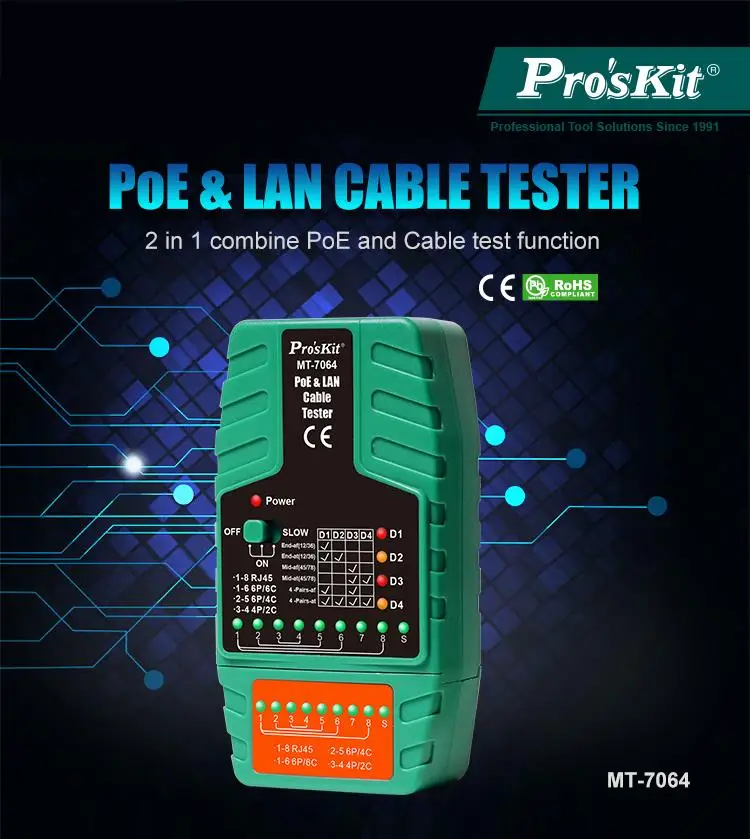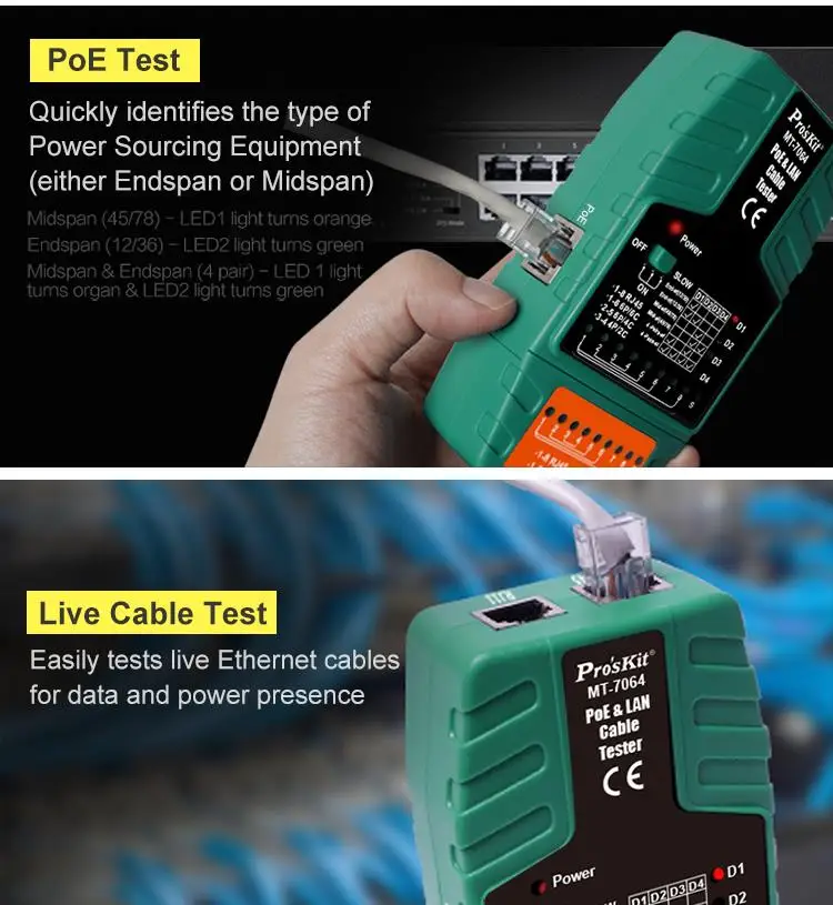 Легко тестирует сеть Ethernet на наличие питания по сети Ethernet Быстро определяет тип источника питания (Endspan или Midspan MT-7064-это усовершенствованный тип, который может легко идентифицировать IEEE 802,3 af/at PoE standard и Midspan/EndspanТестер кабеля