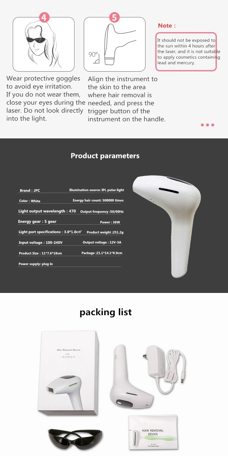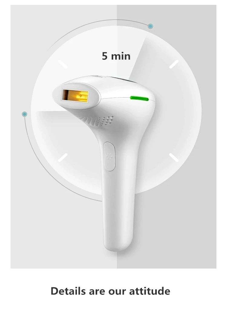 【Используйте tips】он подключается, а не для зарядки. Пожалуйста, следуйте плану удаления волос для удаления волос. Наши продукты прошли строгий контроль и полностью соответствуют различным экспортным стандартам. Свяжитесь с нами немедленно, если вы не удовлетворены нашей продукцией, мы дадим вам удовлетворительное решение. 【Постоянное и безболезненное удаление волос 】это IPL Удаление волос имеет клинически доказанную технологию IPL (сильный импульсный светильник), чтобы помочь вам достичь постоянного удаления волос и гладкой кожи, разорвав цикл восстановления волос. Постоянное удаление волос в течение 8 недель без щетины, вросших волос, покраснения или другого раздражения. 【 Срок службы-используется этот лазер для удаления волос с 500000 вспышками, которые обеспечивают полное домашнее лечение тела до 20 лет. Вспышка будет нежной, особенно для чувствительной кожи или чувствительной области. Встроенный датчик не будет производить импульсы, если вы не прижмете окно на кожу, гарантируя безопасность каждого лечения. 【 5 уровней удаления волос equipped удаление волос оснащено пятью регулируемыми настройками энергии на светильник для обеспечения безболезненного постоянного удаления волос. Вы можете регулировать уровень в соответствии с областью кожи и скоростью роста волос. Для первого использования, пожалуйста, начните с уровня 1. 【Автоматический режим и ручной режим 】он имеет два режима, которые применяются к большинству частей области тела. Автоматический режим-удаление волос на небольшой площади. Длинная кнопка нажатия для непрерывной вспышки, подходит для линии бикини, лица и подмышек. Ручной режим-большие области для эпиляции. Один пресс, одна вспышка, подходит для спины, рук и ног.