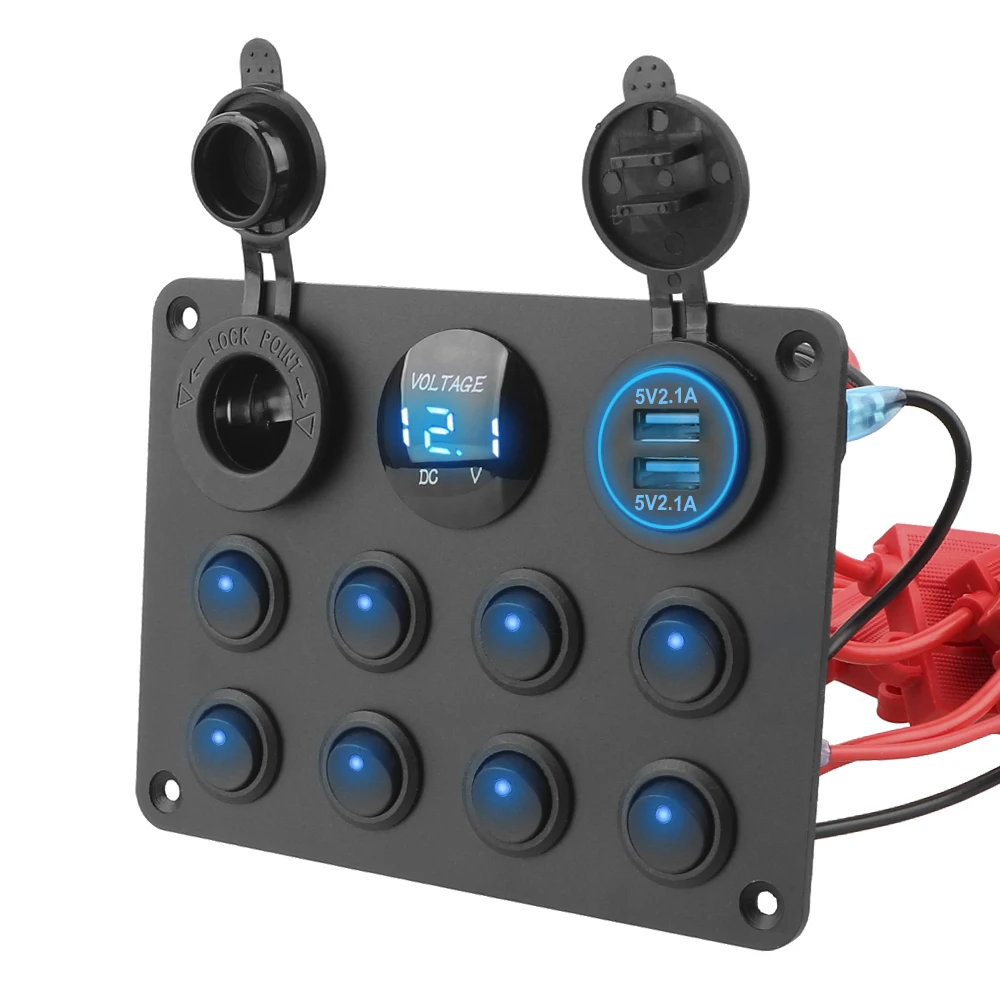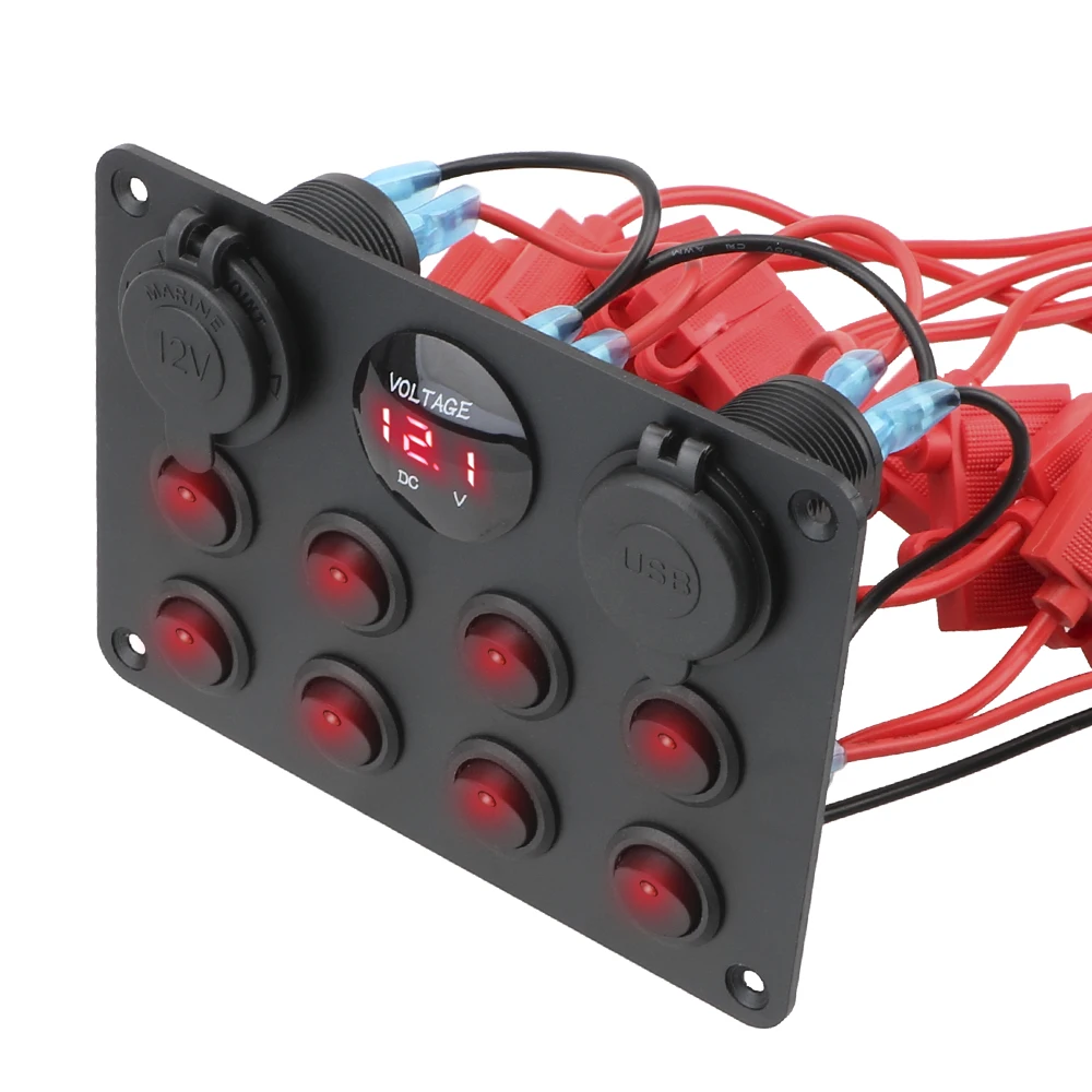 Многофункциональный, 8 переключателей, двойное зарядное устройство USB, гнездо прикуривателя и светодиодный вольтметр.