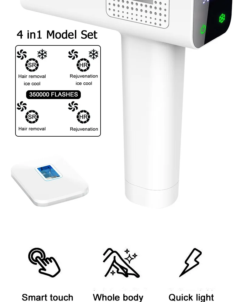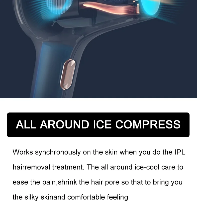 Эпиляция + Синхронный холодный компресс + Функция омоложения работает в 4 режимах: только эпиляция, только омоложение, удаление волос + холодный компресс, омоложение + холодный компресс.