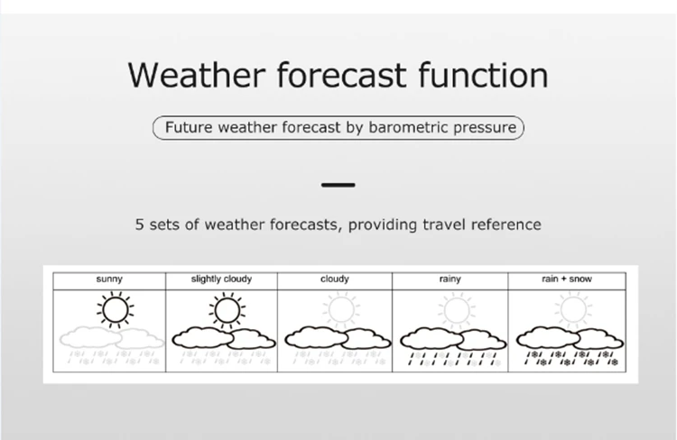 • Five-level weather forecast: sunny, cloudy, cloudy, rain, rain+snow