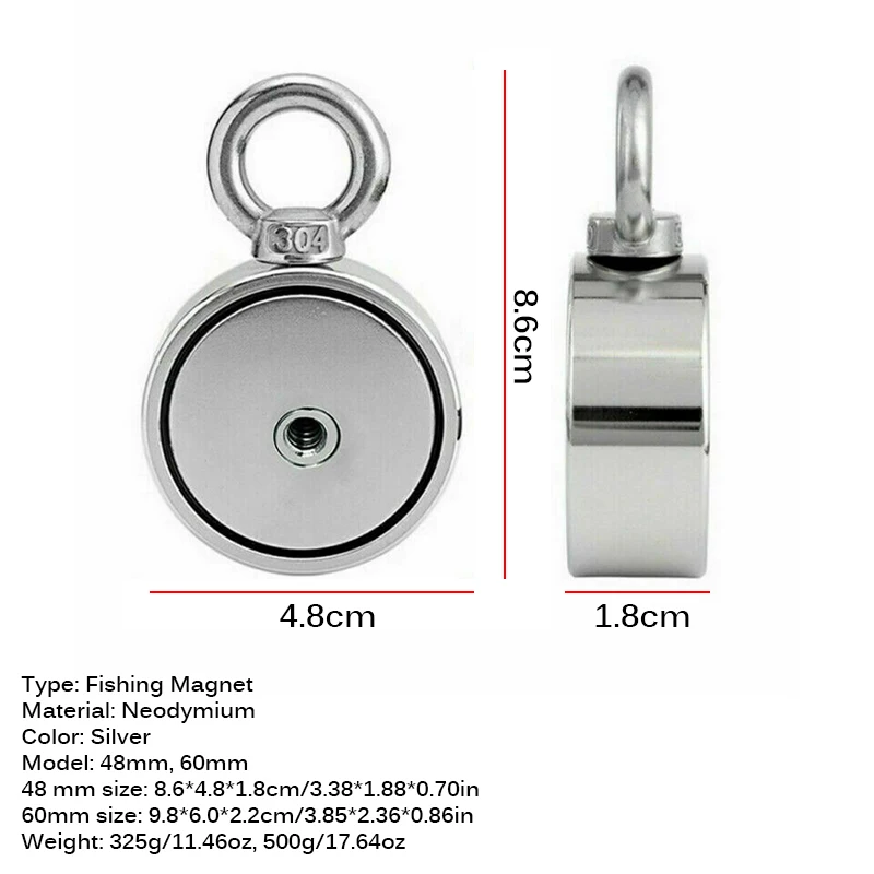 Type: Fishing Magnet Material: Neodymium Color: Silver Quantity: 1pc Model: 48mm, 60mm 48 mm size: 8.6*4.8*1.8cm/3.38*1.88*0.70in 60mm size: 9.8*6.0*2.2cm/3.85*2.36*0.86in Weight: 325g/11.46oz, 500g/17.64oz