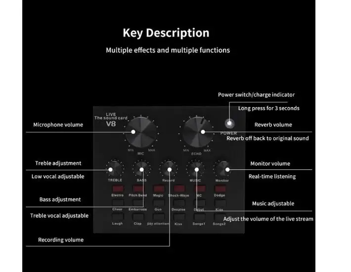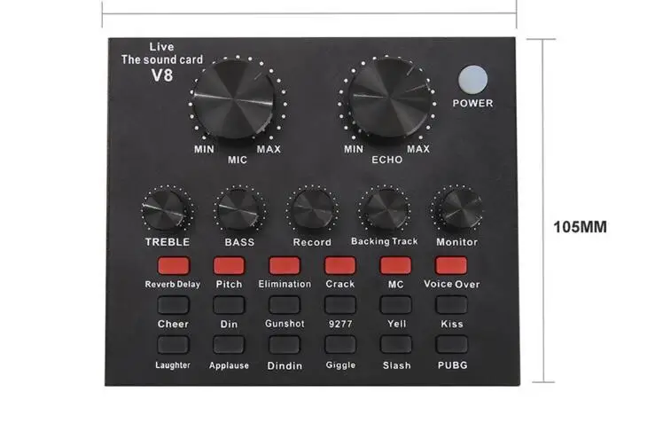 V8 мобильный телефон Микрофон Live Usb внешняя звуковая карта для мобильного компьютера аудио интерфейс звуковая карта с Bluetooth 1. 112 видов электрического звука, 18 видов звуковых эффектов, 6 видов режимов эффекта. 2. Регулировка размера реверберации, регулировка громкости микрофона, высокая регулировка басов, управление громкостью записи, управление громкостью музыки, контроль громкости (функция наушников). 3. Поддерживает мобильный телефон, компьютер, поддерживает использование одной гарнитуры. 4. 7 видов способов подключения: один мобильный телефон K song live, двойной мобильный телефон live, три мобильный телефон live, мобильный телефон синхронный live, один компьютер live, компьютерное сопровождение сотовый телефон live, инструмент ввода сотового телефона live. Батарея: литий-ионный аккумулятор Тип интерфейса: USB Тип: внешний Каналы: 2 Особенности: с Bluetooth Материал: металл Цвет: черный Размер изделия: 125x105x2 5 мм/4,92x4,13x0,98 дюймов Посылка в комплект входит: 1 * звуковая карта 3 * аудио кабели 1 * USB кабель 1 * Руководство пользователя на английском языке Только вышеуказанная посылка, другие товары не включены. Примечание: Светильник и различные дисплеи могут привести к тому, что цвет товара на картинке немного отличается от реального. Допускается погрешность в измерениях +/- 1-3 см.