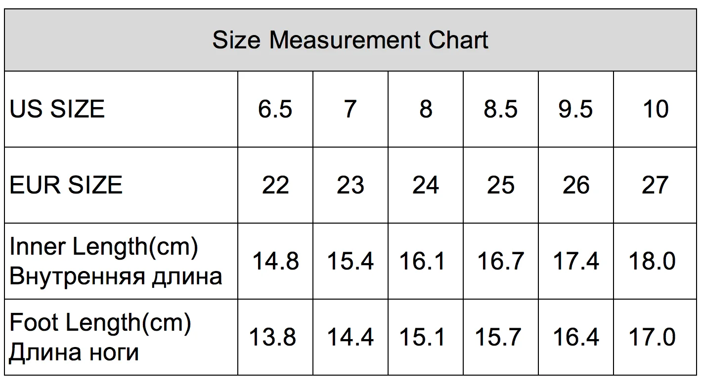 Пожалуйста, ознакомьтесь с таблицей размеров ниже. Выберите свой размер в соответствии с длиной стопы. Как только Найдите длину стопы, которая вам нужна, затем найдите соответствующий размер США/Евро для размещения заказа.