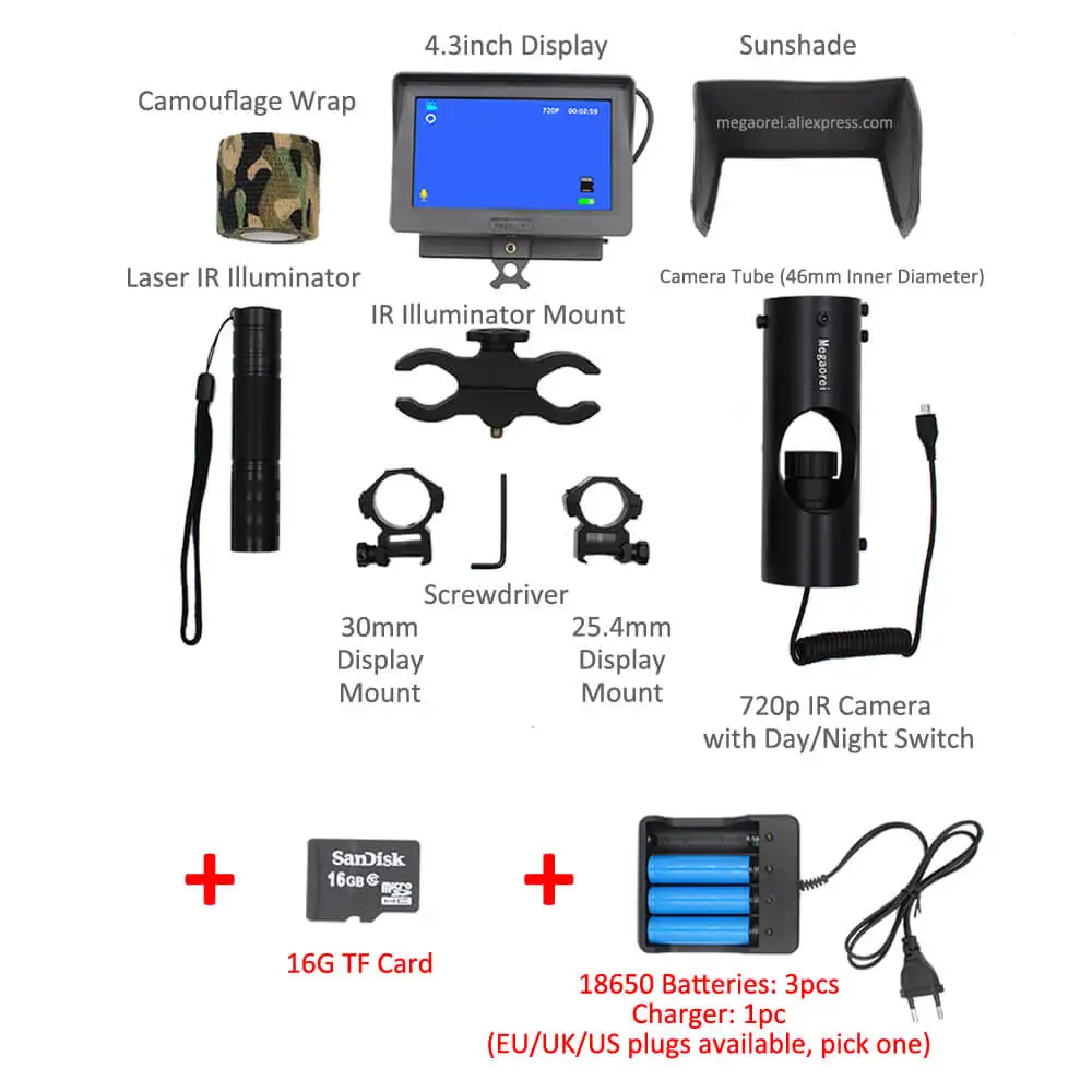1 камера ночного видения (3MP, 720 HD, 16 мм Lense, дневное/ночное видение, регулируемый фокус) 1x4,3 дюймов дисплей (, запись видео, сфотографировать, мужские солнцезащитные очки день/ночное видение, Разъем для карты TF) 1 инфракрасный ИК-фонарик 850 нм (дальность обзора 200-400 м, увеличение/уменьшение зума) 1 трубка для камеры (подходит для окуляра 40-45 мм) 1x25,4 мм дисплей Маунта 1x30 мм зажим для крепления дисплея 1x IR фонарик крепление 1x отвертка 1 Камуфляжная Лента (случайный цвет) 1x солнцезащитный экран Следующие аксессуары в комплект не входят: 3 шт. аккумуляторов 18650 необходимы для питания комплекта: (2 шт. для камеры и экрана) (1 шт. для ИК-фонарика) 1 шт. tf-карты (MicroSD карта) необходимо для записи видео и фотографирования
