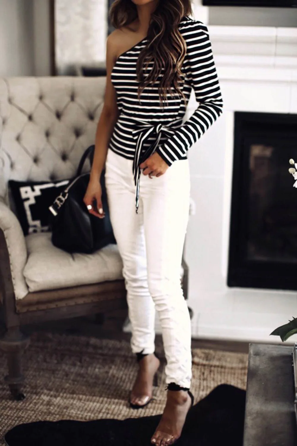 Осень 2020, модный черно-белый свитер в полоску с длинным рукавом и одним плечом, женский простой темпераментный свитер на шнуровке для женщин