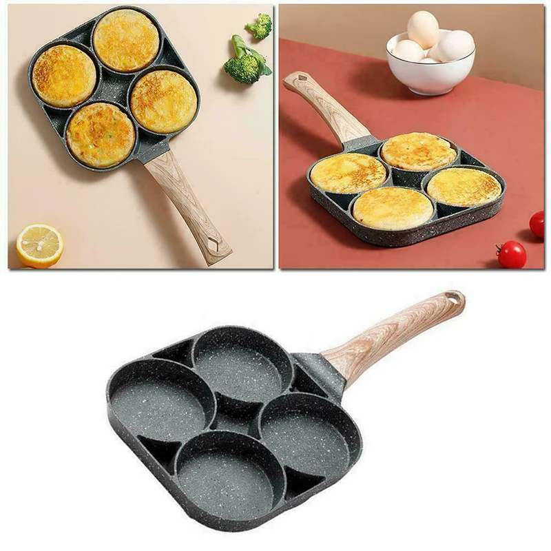 Сковорода для бургеров с 4 отверстиями для жарки яиц, антипригарная блинница для ветчины с деревянной ручкой, подходит для газовой плиты и индукционной плиты