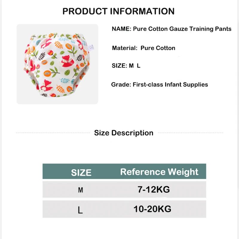 Информация о продукте: Наименование: Детские моющиеся подгузники Материал: Sofe Чистый хлопок Подходит для: 6 + месяцев ребенка Примечание: Без оригинальной цветной коробки, мы будем использовать PE или мешок пузыря, чтобы упаковать его хорошо и защитить его. Не волнуйтесь. Если товар поврежден, пожалуйста, сначала свяжитесь с нами, прежде чем оставить отзывы, спасибо за понимание Из-за ручного измерения размер может отличаться на 1-4 см Из-за различных мониторов цвет может отличаться