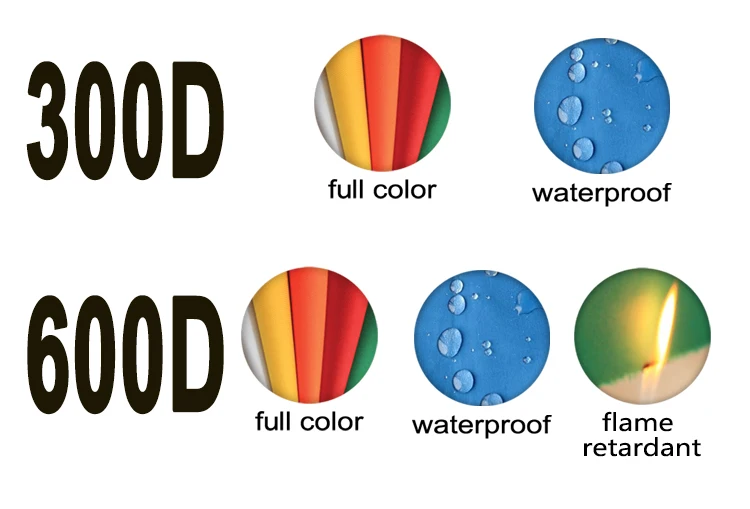 300D является водонепроницаемым, 600D является водонепроницаемым и огнезащитным, оба из них напечатаны в полной цветовой гамме Технология передачи печати, любой дизайн/цвет могут быть напечатаны, они хороши для небольшого количества, или есть количество, но Должен быть разный дизайн один за другим, или сложный дизайн заказа 420D является водонепроницаемым, который является простым цветом или напечатан технологией шелкографии, для простого дизайна или логотипа Печать, это хороший выбор для большого количества и простой дизайн заказа