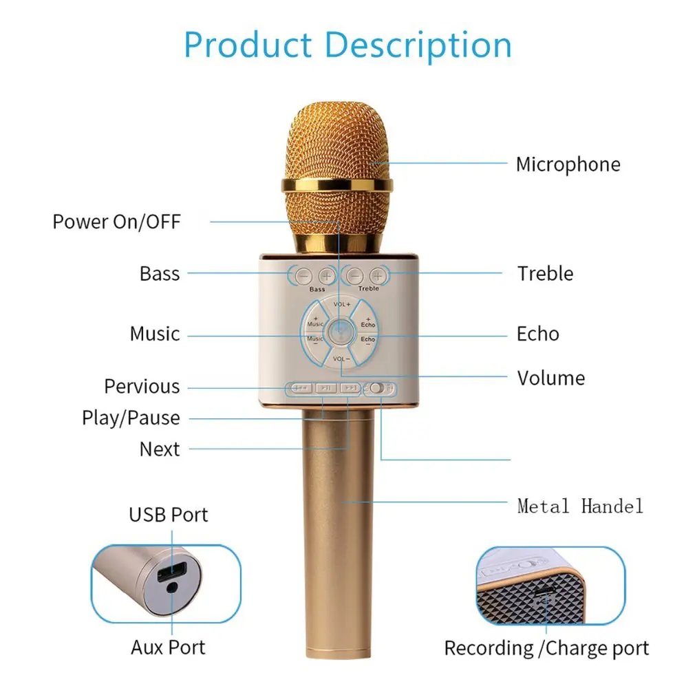 Особенности: 1. Портативные караоке-микрофоны: самые удобные вечерние принадлежности, любые домашние вечерние, дорожные и походные, идеально подходят для демонстрации голоса. Описание: Легкий, который так удобен, чтобы взять его на открытом воздухе для развлечений. Характеристики: Пикап: емкостный Посылка включает в себя: