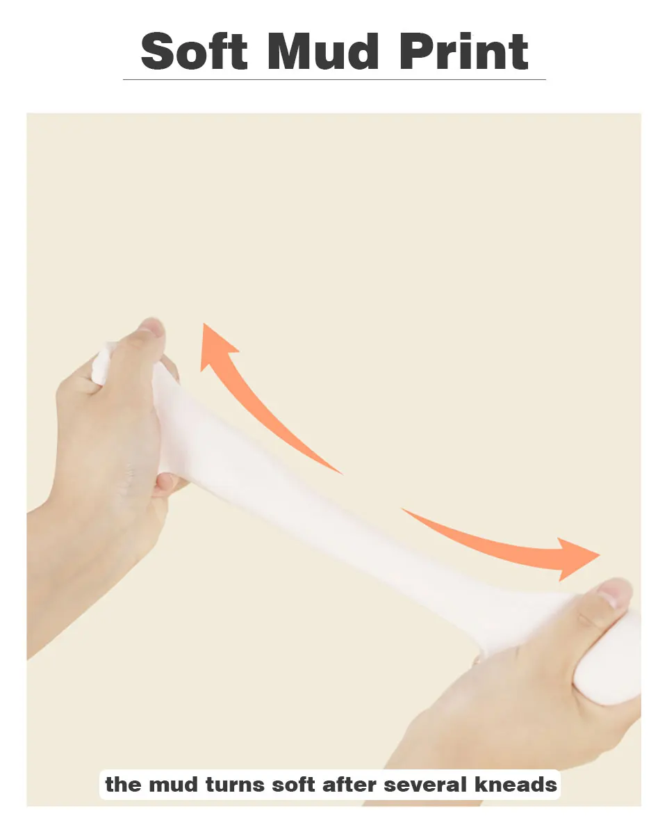 * Step1: подготовьте Поместите все аксессуары на чистую и ровную поверхность. * Step2: чувствовать себя На мягкость грязевого принта влияет температура. Если грязь слишком жесткая, погрузите ее в пакет в 40 ° воды. * Step3: мять Разминайте грязь в течение 2-3 минут, чтобы смягчить ее. Сделайте грязь овальной или другой формой. * Step4: Пресс Положите грязь на бумагу. Рулон деревянной палочки на До тех пор, пока поверхность не будет плоской. Не забудьте указать толщину. * Шаг 5: сделать печать Убедитесь в чистоте рук и ног ребенка. Равномерно прижмите руку/ногу к грязи. Удерживайте нажатие в течение 5-10 секунд. * Шаг 6: высушить Поставьте произведение в сухом месте на 3-5 дней. Возьмите его и высушите еще 2-3 дня. Раскрасьте и положите в рамку, когда она полностью высохнет.