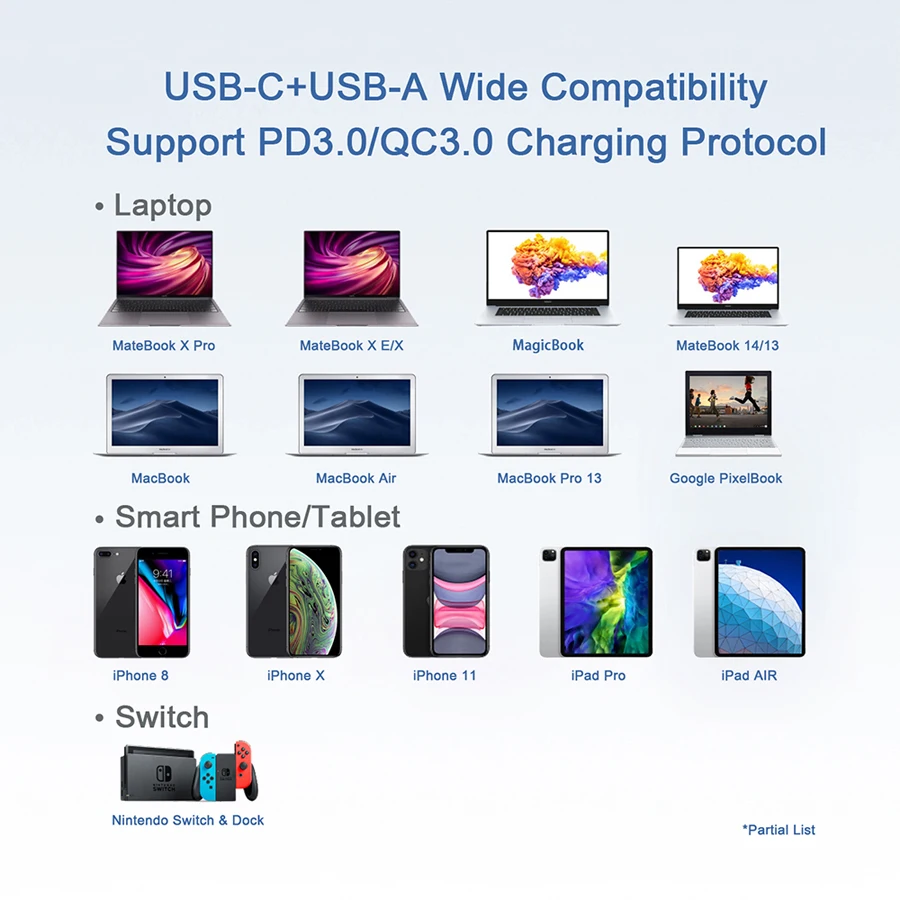 Описание товара: * Вход: 100-240 В ~ 50/60 Гц 1.6A Макс. USB-C Выход: 5 В/2,4 А, 9 В/3 А, 12 В/3 А, 15 в/3 А, 20 В/3,25 А (макс. 65 Вт) USB-A Выход: 5 В/2,4 А (макс. 12 Вт) Совместимость с (частичный список): * Телефоны IPhone XS / XS Max / XR / X / 8 Plus / 8 / 7 / 7 Plus / 6; samsung Galaxy S10 / S10e / S10 + /S9 / S9 + / S8 / S8 + / Note 9 / Note 8; Huawei P10 / Mate 9 / Mate 20X / Mate 20 Pro; LG G7 / V30 +, Google Pixel / Pixel 3XL / 3 / 2XL / 2, Nexus 5X / 6P, Sony XZ2 Premium, Sony XZ3 и многое другое * Планшеты IPad Pro 12,9 ''/iPad Pro 10,5''/iPad Pro 11 ''; Примечание: Используйте кабель Lightning USB-C для быстрой зарядки моделей iPad раньше 2018 года и всех совместимых iPhone. * Ноутбуки MacBook Air 13 ''(2018)/MacBook 12''/MacBook Pro 13 ''/MacBook Pro 15''; Dell XPS 13/XPS 15, Inspiron 13/Inspiron 7000, HP Elite X2/Elitebook X360, Spectre 13/ Spectre 15 /Spectre x360 / Spectre Folio 13-ak0000tu, Huawei Matebook X / MateBook X Pro/Matebook 13 WRT-W29 / Matebook E/Matebook D, lenovo ThinkPad X1, йога 720, И Xiaomi Air, и многое другое Это зарядное устройство имеет широкий спектр совместимости, не все совместимые модели устройств перечислены выше. Примечания: * Протокол PPS / SCP не поддерживается * Серия HUAWEI Mate 30,P40,P40 Pro и другие ноутбуки/Планшеты Huawei с протоколом SCP, так что только utput также 18 Вт. * Samsung Galaxy Note 10 / Note 10 + с PPS протоколом, поэтому не поддерживает 45 Вт/25 Вт быстрой зарядки, но может использовать 9 В 2A 18 Вт. * Посылка: 1X GAN 65W USB C настенное зарядное устройство Гарантия: Предоставление отличного опыта покупок очень важно для нас. Если вам не нужны товары без каких-либо причин, мы с радостью примем возврат и возврат средств в течение 30 дней. Гарантия 12 месяцев на обмен. В любом случае, возврат или возврат средств доступны. (Совет: пожалуйста, дважды проверьте модель вашего устройства и купите его с уверенностью!)