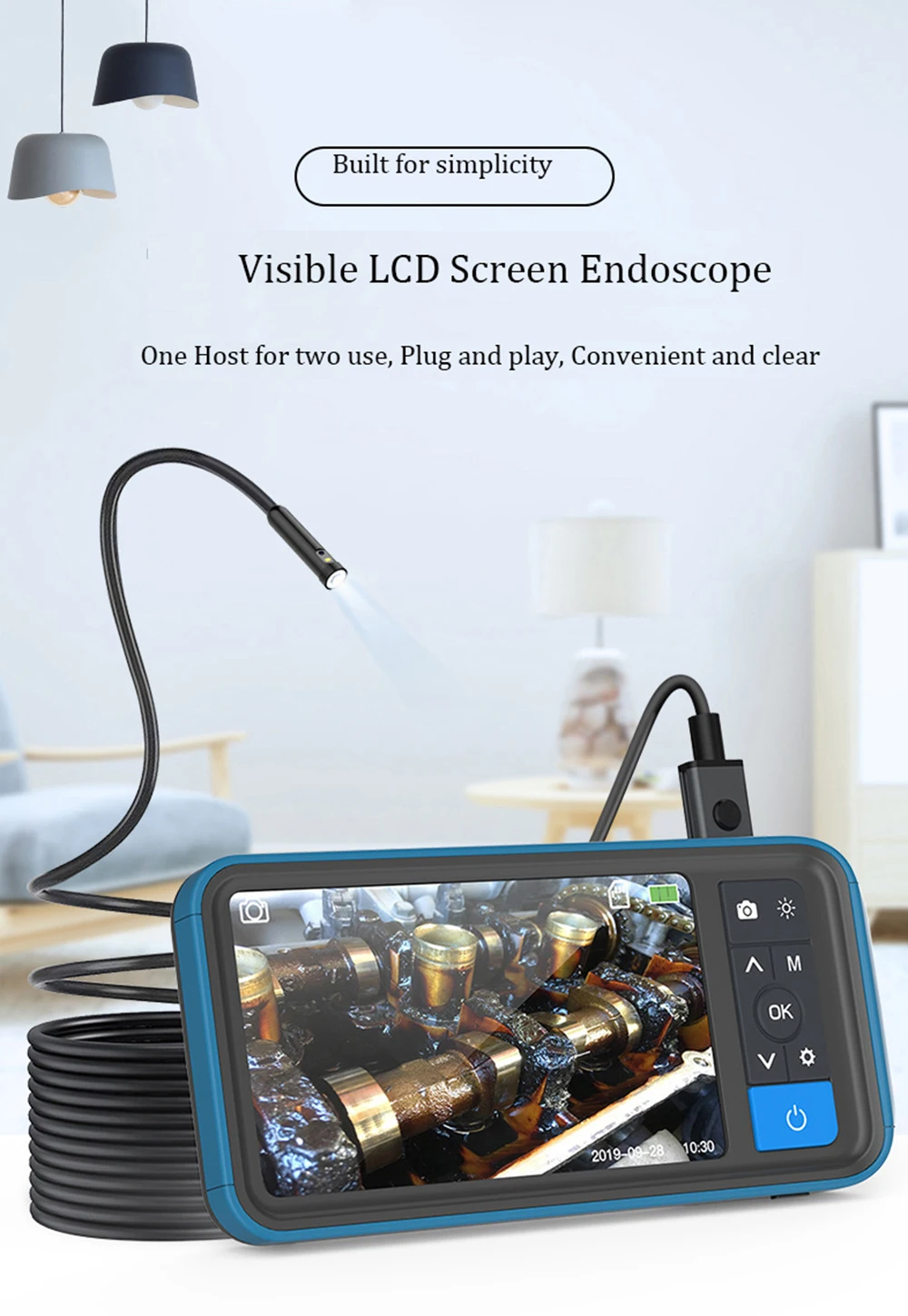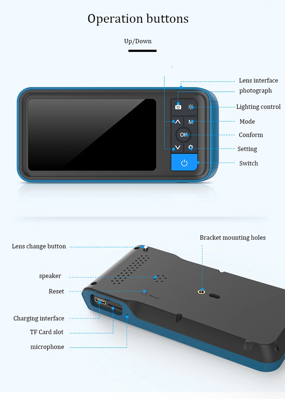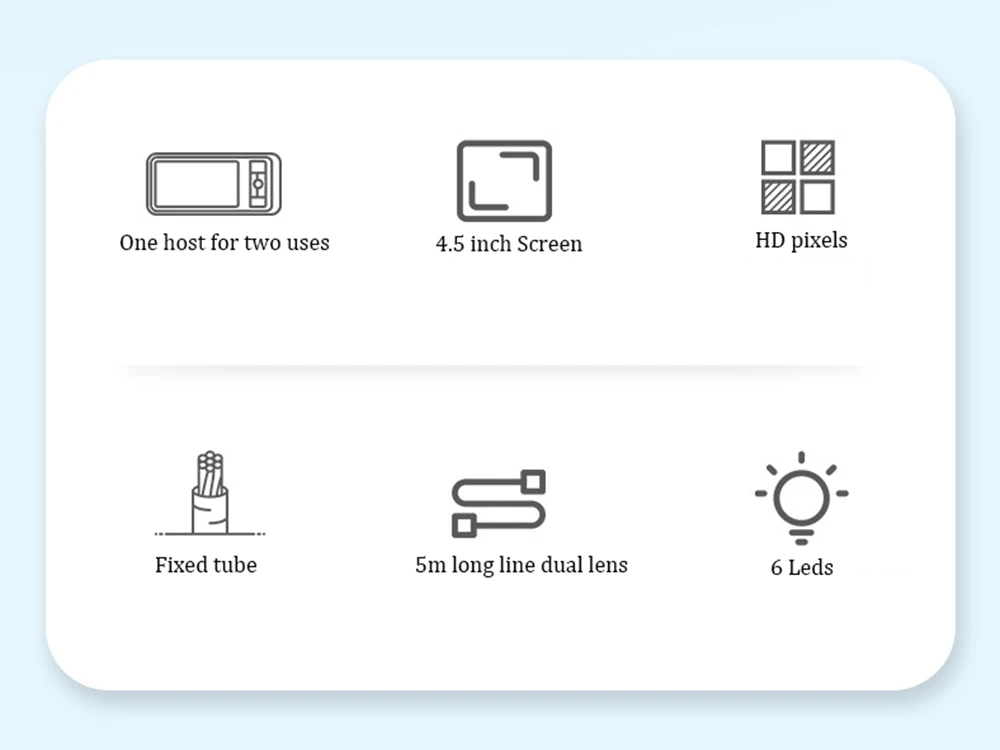 Монитор: Тип экрана: 4,5 дюймов Цвет ЖК-дисплей Разрешение: 854*480 пикселей (QVGA) Вращение: 180 ° Разрешение записи видео: 1280*720, 1920*1080 (пикселей) Разрешение захвата изображения: 1920*1080 (пикселей) Языки меню: английский, французский, испанский, китайский, японский, немецкий, итальянский, русский Порт: Порт удаленного подключения, USB, слот для tf-карты Камера эндоскопа: Диаметр: 5,5 мм Однообъективная/8,0 мм с двумя объективами Длина провода: 5 м Разрешение: 2,0 мегапикселей Угол обзора: 70 ° Глубина поля: 30 мм-100 мм Светильник источник света: 6 Регулируемых светодиодов высокой интенсивности Прочее: Рабочая температура: от 32 до 113 °F (от 0 до 45 °C) Мощность: 2500 мАч литиевая батарея (в комплекте)