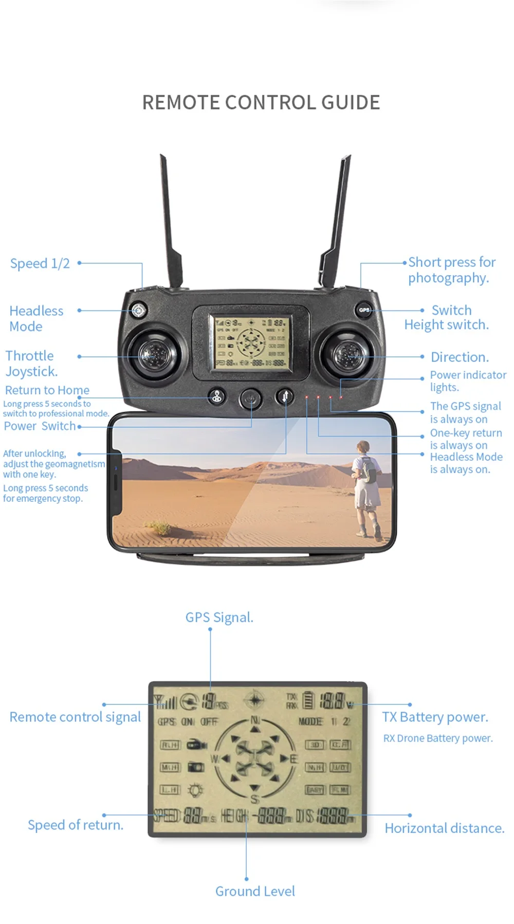 С светодиодный светильник, Дрон оснащен 6-осевым гироскопом, вертолет с гироскопом функция тарирования, поддержка функции, такие как восходящий, нисходящий, вперед, назад, движение задним ходом, левый поворот, правый поворот, 360 градусов рулон, безголовый режим и регулировка скорости. Поддержка многоточечного планирования маршрута и функции постепенного расстояния полета: самолет будет летать автономно в соответствии с заданным маршрутом, и игрок будет фокусироваться на съемке. Поддержка окружности с фиксированной точкой: Найдите среднюю точку окружности, а затем используйте джойстик для перемещения желаемого радиуса окружности. После того, как мобильный телефон будет активирован, объектив дрона всегда будет нацелен на цель, и высокая и низкая скорость может быть переключена по желанию, не беспокоясь о направлении, И операция безопасна и проста. Расстояние дистанционного управления до 500 метров. Есть новый/Главный режим, режим GPS, нормальный режим и т. д. опционально.