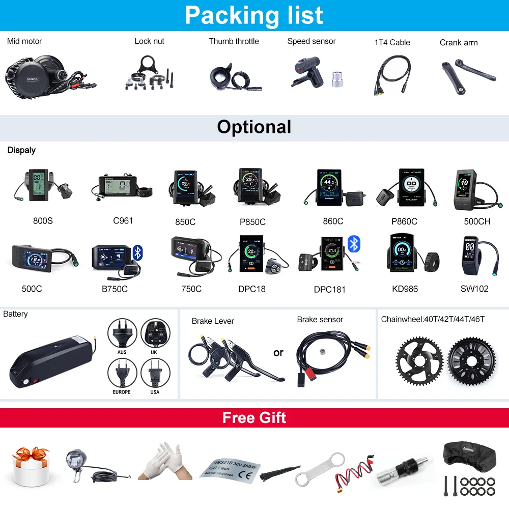 ★★★★★Универсальная совместимость:Комплект мотора Bafang BBS Mid drive совместим с fatbike, горный велосипед, дорожный велосипед и так далее. Этот комплект предназначен для стандартного нижнего кронштейна 68-73 мм.