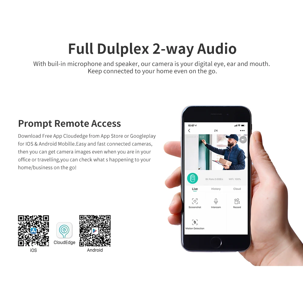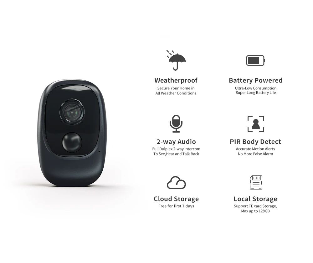 Название приложения для смартфона: CloudEdge Разрешение: -Камера с аккумулятором Full HD 1920*1080P Питание от аккумуляторной батареи: -Встроенный аккумулятор 6000 мАч -Уведомления о низком уровне заряда батареи -Время полной зарядки: 5 В 1A/2A адаптер: 4-8 часов Двухстороннее аудио: -Прослушивание и разговор через приложение для смартфона Ночное видение: -До 10 метров (33 фута) ночного видения Хранение: -Карта TF 128G с функцией перезаписи (не встроенная) -Облачное хранилище с 7 днями бесплатно; После 7 дней, если вам нужны облачные услуги хранения, вам нужно купить облачные услуги. Умное оповещение: -ПИР движения срабатывает с сигнальным снимком, push-уведомлениями приложения и записью тревоги -Интеллектуальное воспроизведение событий запись путем перетаскивания временной шкалы. Угол обзора: -Угол обзора 120 градусов Класс водонепроницаемости: -IP66 сертифицированный водонепроницаемый Установка: -Только с кронштейнами. Легко Отрегулируйте угол. Так что не беспокойтесь о том, что Магнитный исчезнет после длительного использования и уроните, чтобы навредить кому-то. Размер продукта: -Батарея Камера: 6,3*5,3*9 см (Д * Ш * В) Аксессуары: -Батарейная камера -Кронштейн -Винтовая сумка -Руководство пользователя -Usb-кабель