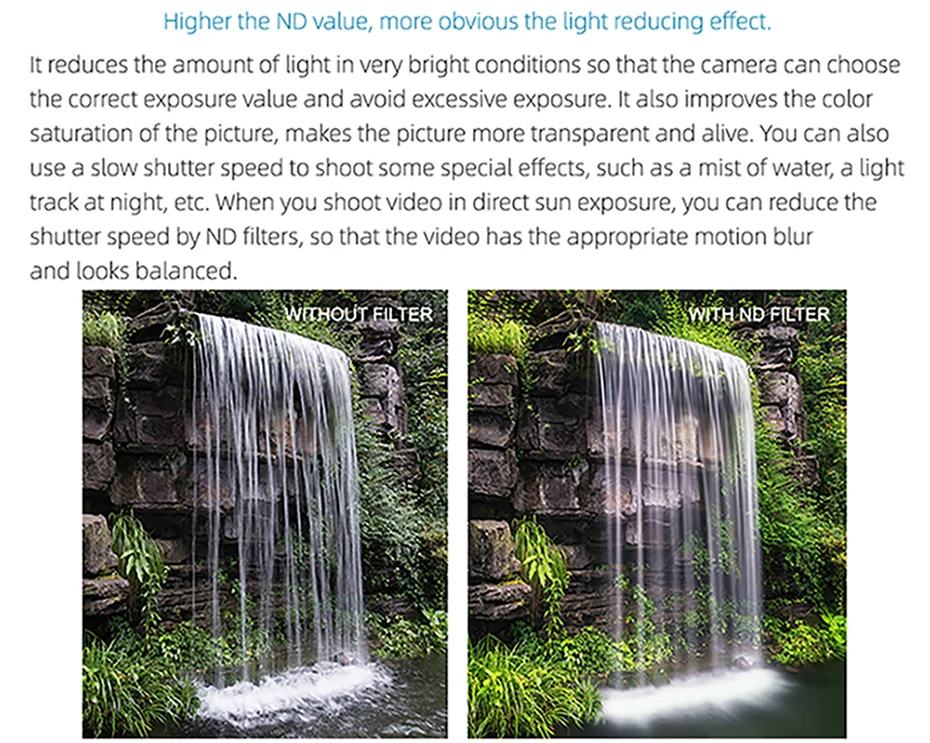 ND фильтр уменьшает количество попадания на светильник в датчик, давая вам свободу создавать свою собственную работу, позволяя больше управлять диафрагмой камеры, временем экспозиции и настройками чувствительности датчика. Цифры в задней части представляют уровень затемнения.