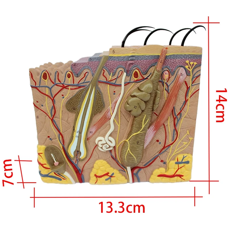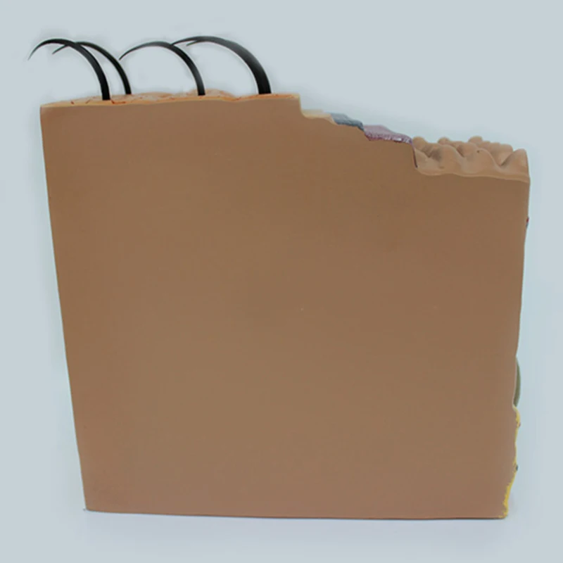 Модель состоит из эпидермиса и дермы двух частей, в общей сложности четыре части, Подкожная клетчатка и глубокая структура соединены, и отображает эпидермис, подкожная структура и Подкожная клетчатка и придатки кожи (волосы, сальные желоба, потовые желеобразные клетки и нервные окончания), В общей сложности 25 знаков. Компактный, легко носить с собой!