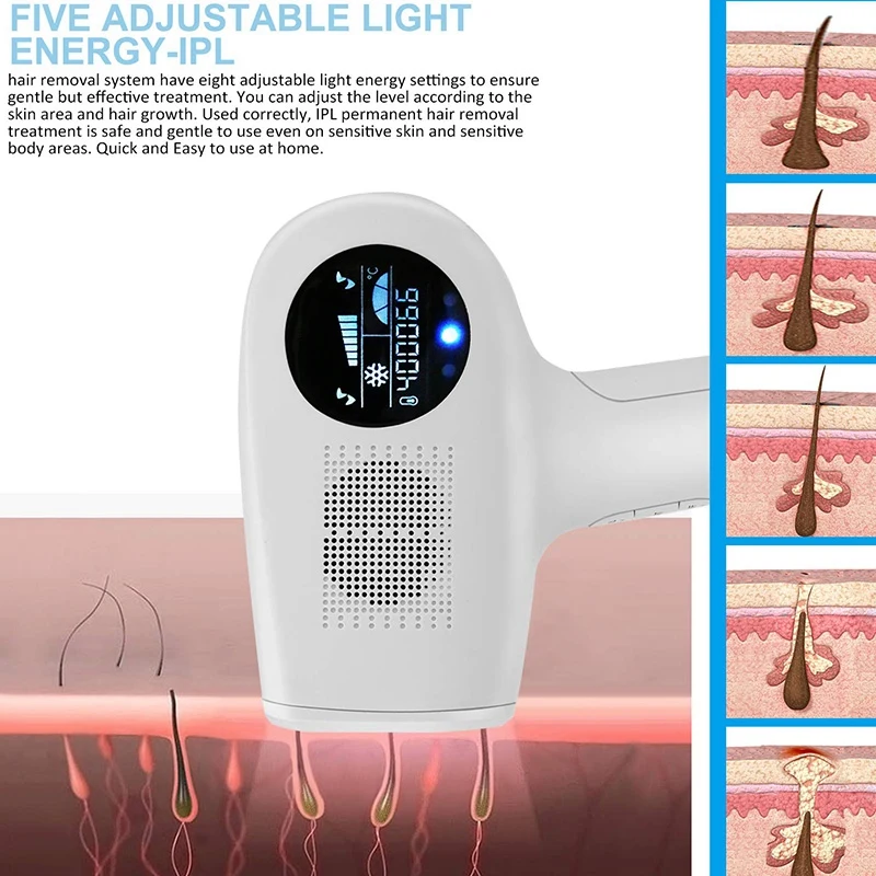 Диммируемая энергия-система удаления волос IPL имеет пять настроек энергии с регулируемой яркостью, чтобы обеспечить нежное и эффективное лечение. Вы можете регулировать уровень в соответствии с областью кожи и ростом волос. Правильное использование, IPL постоянное удаление волос можно использовать безопасно и мягко, даже на чувствительной коже и чувствительных частях тела. Быстрый и простой в использовании дома