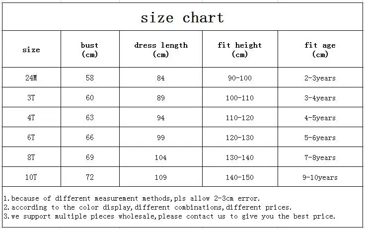 6 размеров в наличии: размер 24M подходит для роста 90-100 см Размер 3T подходит для роста 100-110 см; Размер 4T подходит для роста 110-120 см; размер 6T подходит для роста 120-130 см; Размер 8T подходит для роста 130-140 см; Размер 10T подходит для роста 140-150 см; Пожалуйста, выберите правильный размер для вашего роста. Если ваша принцесса весит больше вашего обычного тела, пожалуйста, выберите больший размер