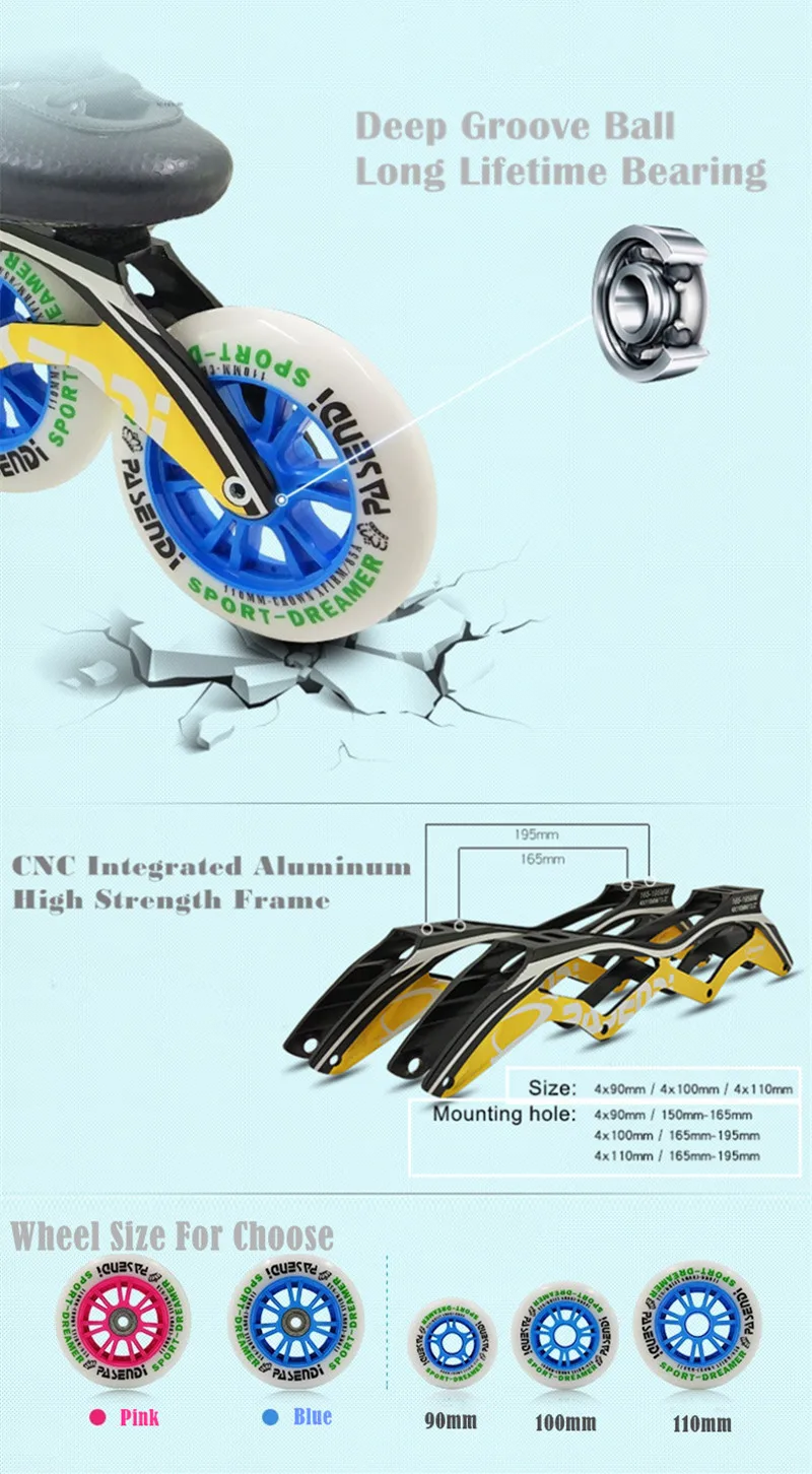 Бренд: PASEND Обувь: углеродное волокно Цвет: черный Размер: Европейский (33-45) Рама: Интегрированная рама для скоростного катания из алюминиевого сплава Размер: 4x90 мм (150-165) 4x100 мм (165-195) 4x110 мм (165-195) Колеса: резиновое колесо из ПУ Размер: 90 мм 100 мм 110 мм Подшипник: ABEC-9