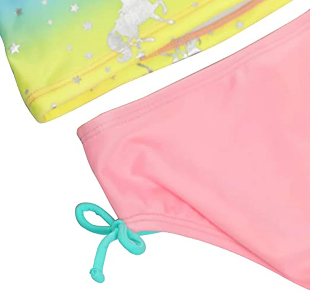 Тонкая ткань для плавания: 82% полиэстер + 18% спандекс, подкладка из 100% полиэстера; Светильник дышащий, Высокоэластичный спандекс идеально подходит для выращивания детей Особенности: приятная для кожи мягкая ткань для чувствительной кожи ребенка и прочная для достижения наилучших результатов. Защита от Солнца-UPF 50, идеально подходит для девочек, чтобы насладиться их плаваньем и пляжным отдыхом Супер восхитительный Рисунок: Уникальный яркий рисунок единорога привлекает внимание, вашему малышу будет очень нравится Стильный дизайн: купальник из двух частей, топ с принтом + треугольные плавки с бантиками по бокам (банты только для вида), плечевой ремень не регулируется О размере: 4 размера в наличии. Размер s переносится из Азиатского размера, если вы не уверены в размере, пожалуйста, свяжитесь с нами