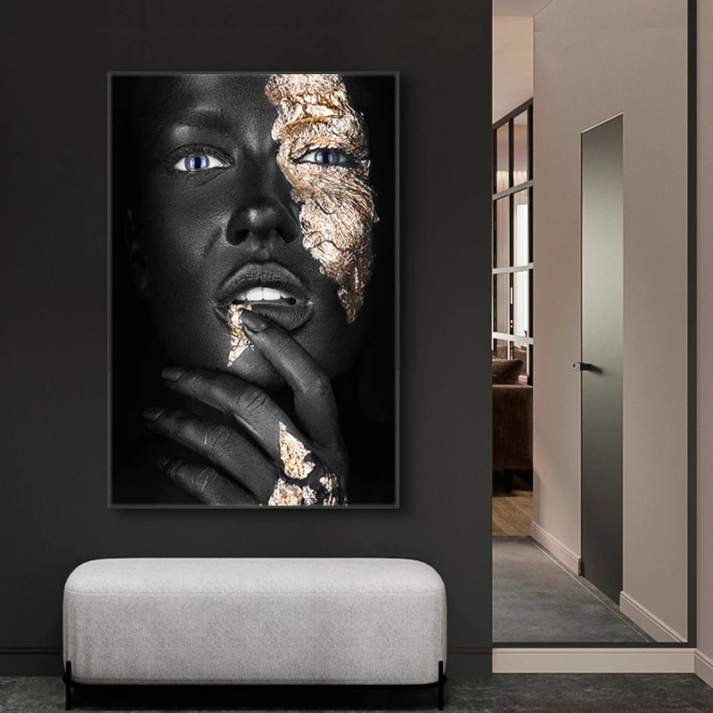 Золотой Черный Модный сексуальный женский портрет, холст, живопись, плакаты и принты африканские девушки настенные художественные картинки для гостиной куадро
