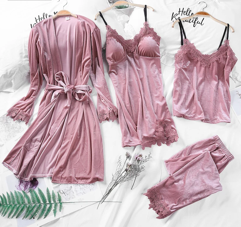 Название: Jerrinut, 4 шт., золотой бархатный пижамный комплект, женская ночная рубашка, ночное белье, сексуальные кружевные пижамы, одежда для сна, ночная рубашка с длинными рукавами, домашний костюм