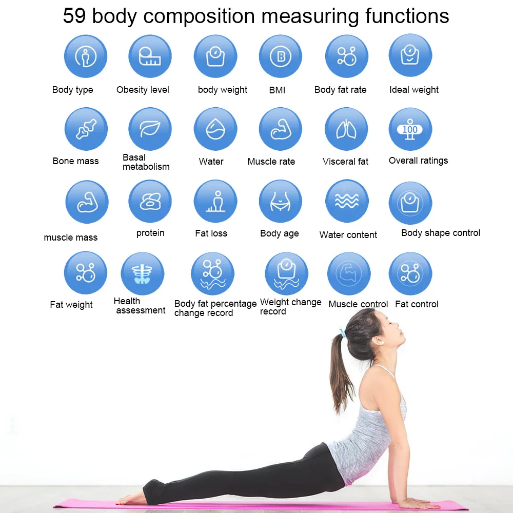 --59 функций измерения состава тела: Эта беспроводная цифровая шкала не только показывает вес тела, но и синхронизирует данные в вашем приложении, включая жир, воду, мышечную массу, ИМТ, костную массу, белок и другие данные, зная больше данных о вашем теле во времени и легко отслеживать на вашем телефоне.