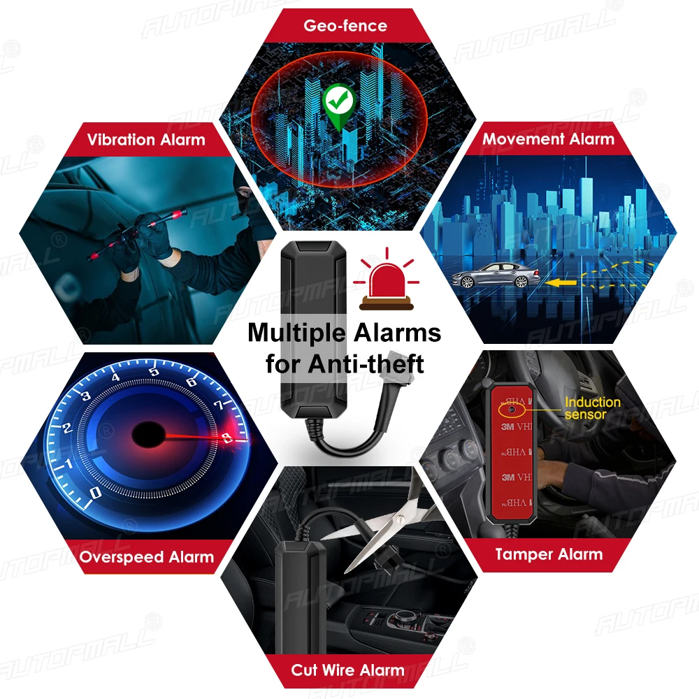 Поддержка аварийной сигнализации, сигнализации движения, гео-забора, охранной сигнализации. Вибрационная сигнализация, отключение проволочной сигнализации, удаленное отключение топлива, сигнализация запуска двигателя, дополнительные данные GPS в области сетевого глухих зон, данные GPS компенсируются поворотом, автоматическим рычагом ACC, сигналом буксировки.